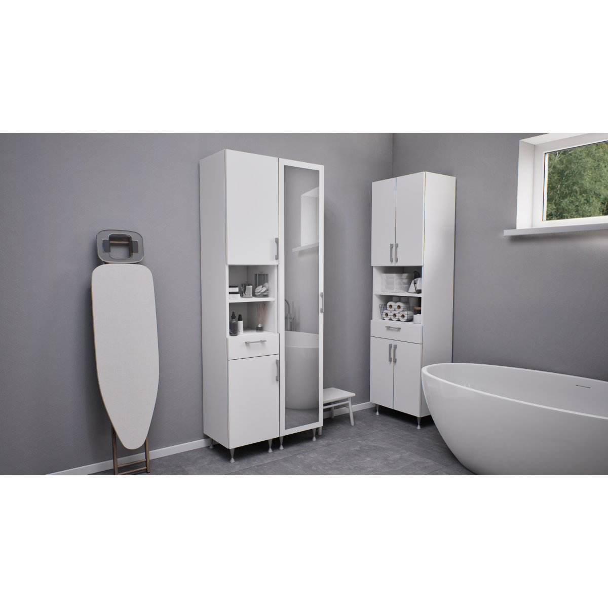 A Hanna magasszekrény letisztult formájával és funkcionális kialakításával a modern fürdőszobák ideális tárolóbútora. A fehér színű, 31,5 cm széles, 180 cm magas és 33,5 cm mély szekrény trendi, mégis visszafogott megjelenésével bármilyen enteriőrbe könnyen beilleszthető, miközben elegendő helyet kínál a mindennapi használati tárgyak számára.
