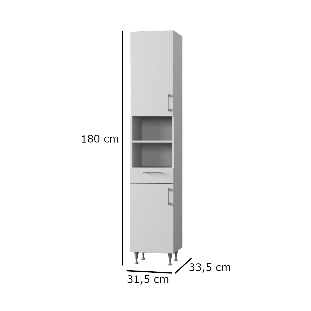 - Hanna álló fehér 31,5 cm x 180 cm x 33,5 cm-es magasszekrény 2 ajtóval, 2 nyitott tárolórésszel, 1-1 belső polccal, 1 fiókkal