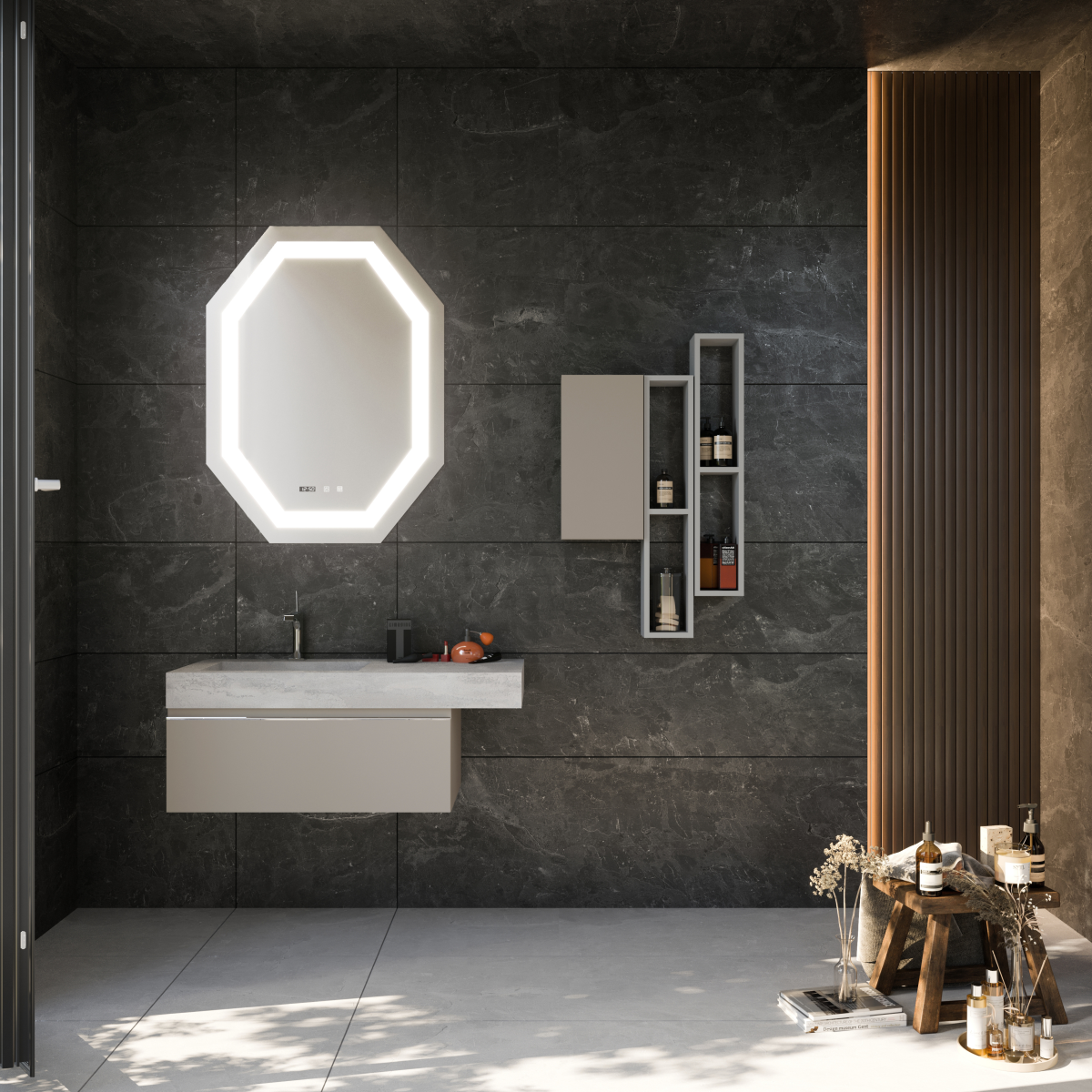 Letisztult, matt felülete elegáns megjelenést kölcsönöz, miközben diszkréten illeszkedik a környezetébe. A 25 cm x 50 cm x 15 cm-es méret helytakarékos, a függesztett kialakítás pedig légies hatást kelt.