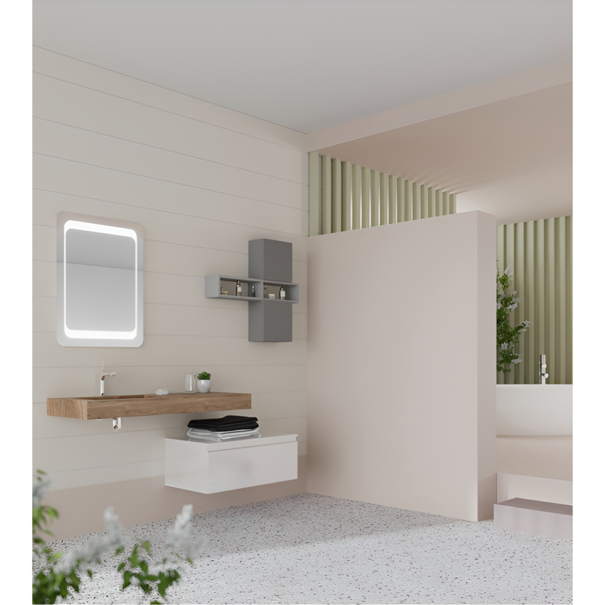 Kompakt mérete ellenére hasznos tárolóhelyet biztosít, ahol a mindennapi használati tárgyak rendezetten, mégis könnyen elérhetően tarthatók. A matt világosszürke felület világosabbá teszi a helyiséget, vizuálisan tágítja a teret, így kisebb fürdőkben is esztétikus hatást kelt. A fali, függesztett kialakítás levegős érzetet ad, miközben a padló tisztán tartását is megkönnyíti.