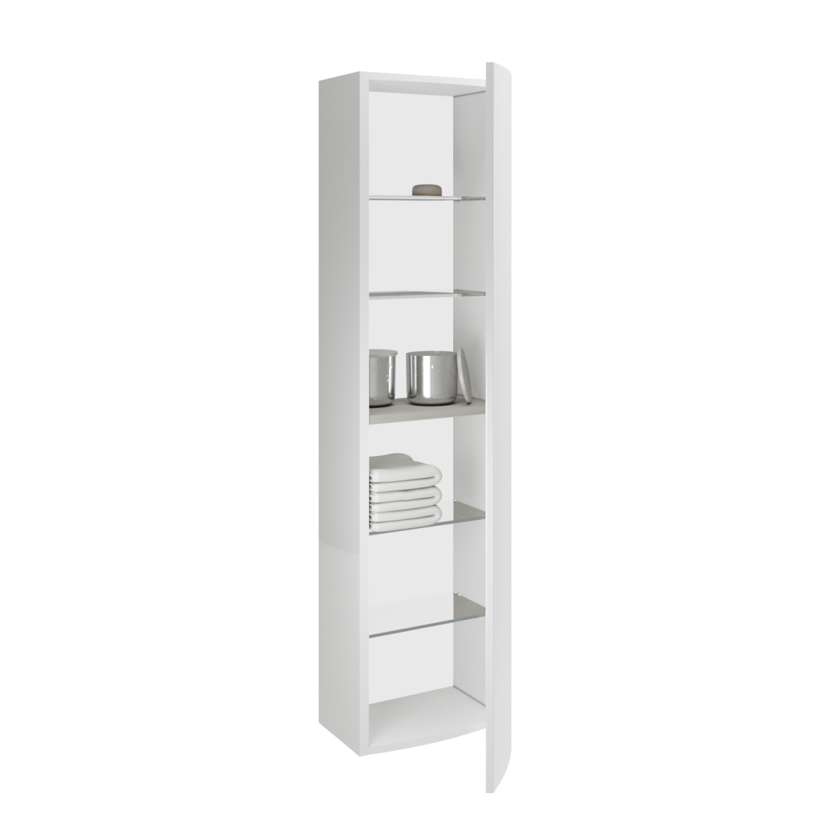 A csillapított záródás kényelmes, halk használatot biztosít a mindennapokban. A belső tér jól tagolt: négy üvegpolc és egy fa polc segít átláthatóan rendszerezni a tisztálkodási és kozmetikai eszközöket. A fehér szín modern, letisztult hatást kölcsönöz, így könnyen illeszthető többféle fürdőszobai stílushoz.