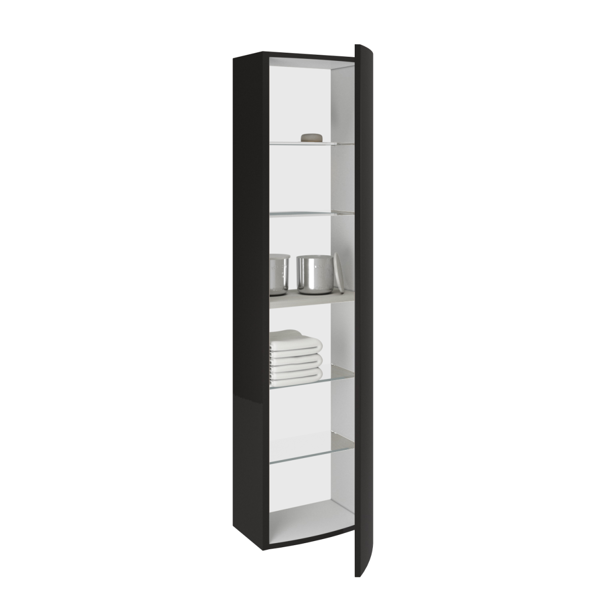 A csillapított záródás kényelmes, halk használatot biztosít a mindennapokban. A belső tér jól tagolt: négy üvegpolc és egy fa polc segít átláthatóan rendszerezni a tisztálkodási és kozmetikai eszközöket. Az magasfényű antracit szín modern hatást kölcsönöz, így könnyen illeszthető többféle fürdőszobai stílushoz.