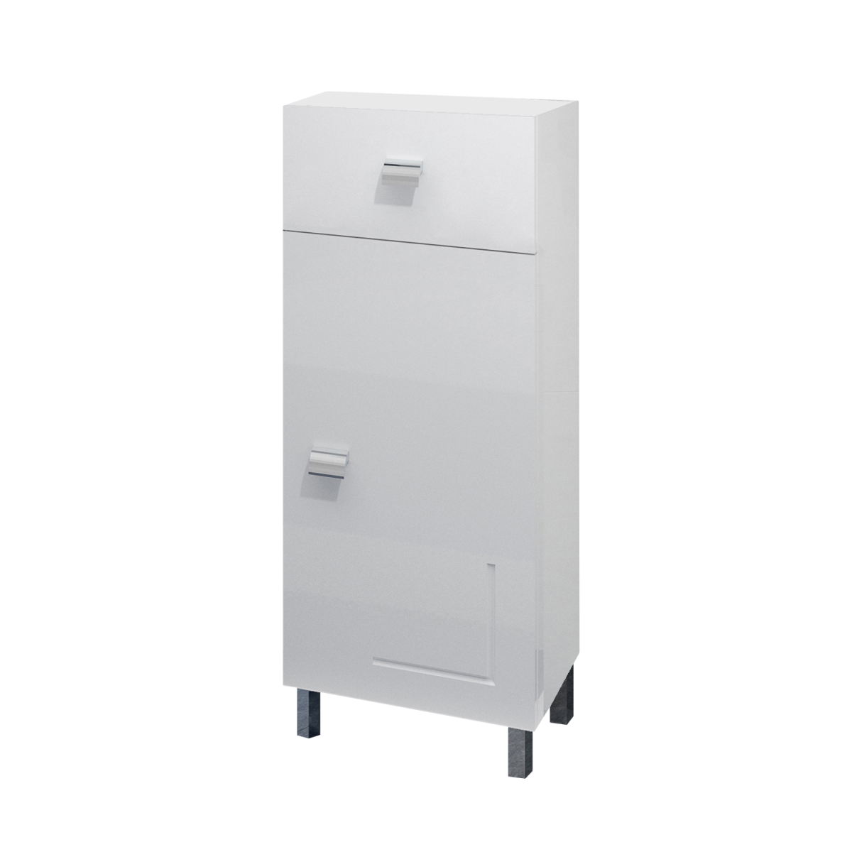 Az Isabella alacsony szekrény letisztult, magasfényű fehér felületével világosabbá és tágasabbá teszi a fürdőszobát.
