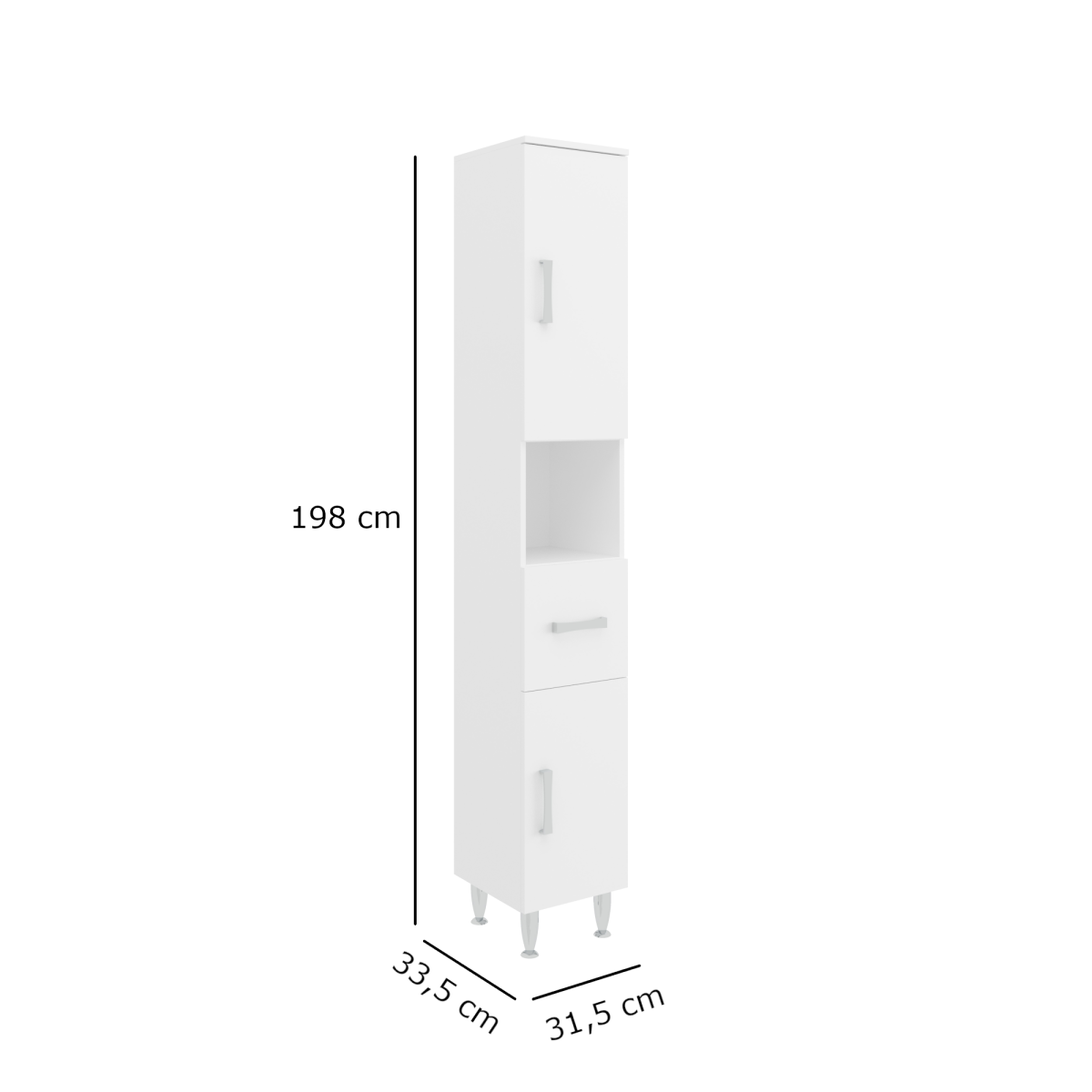 A magas, keskeny kialakítás kifejezetten praktikus, ha a tárolóhely maximalizálása a cél anélkül, hogy sok helyet foglalna. A 198 cm-es magasság bőséges helyet kínál törölközők, tisztítószerek vagy egyéb fürdőszobai kellékek számára.