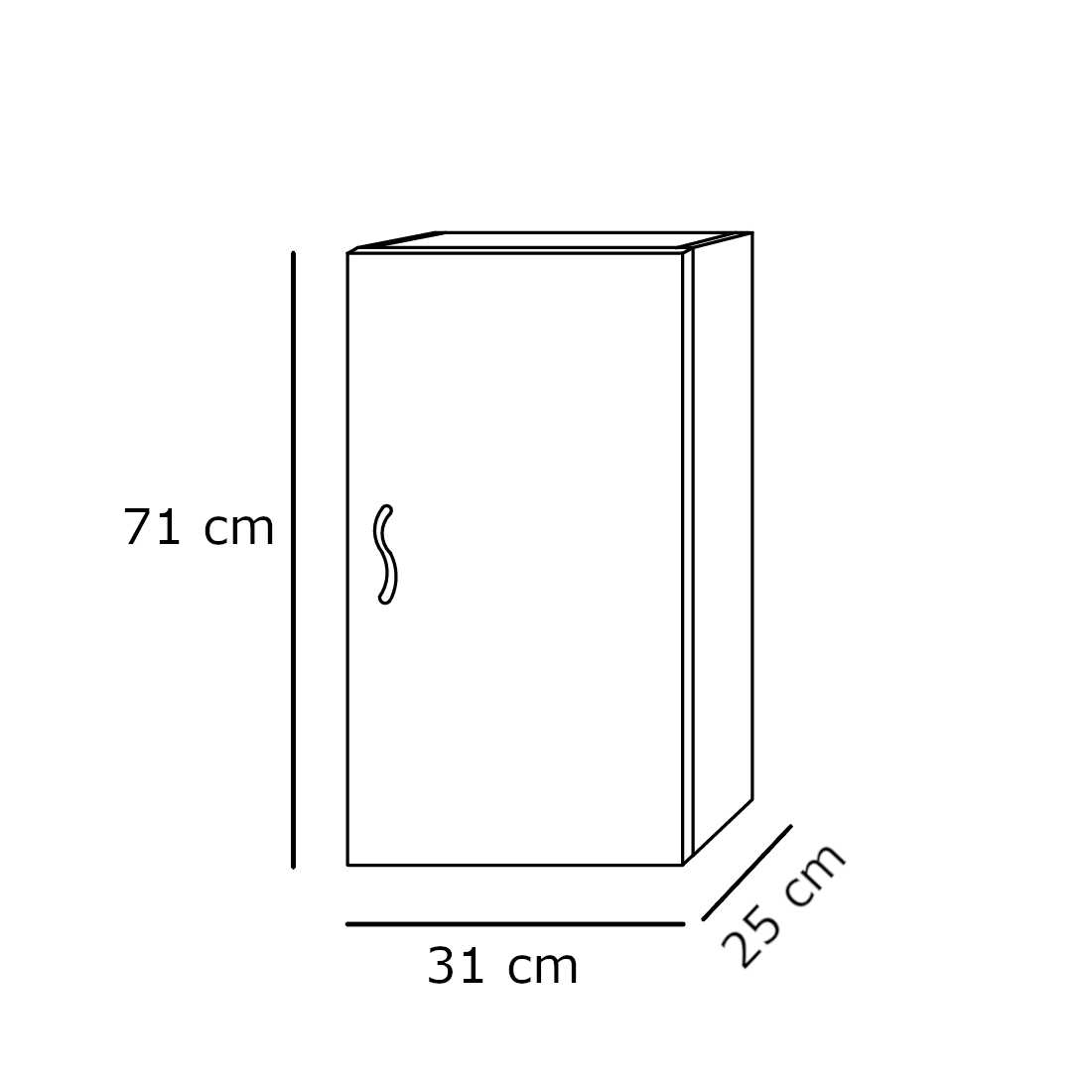 A 31 cm x 71 cm x 25 cm-es, egyajtós kialakítás helytakarékosan biztosít plusz tárolóhelyet a mindennap használt kozmetikumoknak, tisztálkodószereknek. A hullámzó ívű fém fogantyú diszkrét díszítőelem, egyben kényelmes fogást ad a mindennapi használathoz.