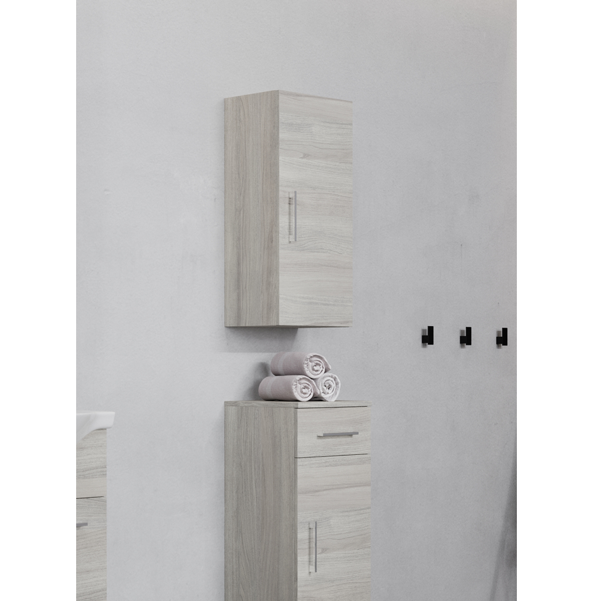 A Rubino világosszürke faliszekrény letisztult formavilágával és természetes árnyalatával tökéletesen illeszkedik modern fürdőszobai környezetbe.