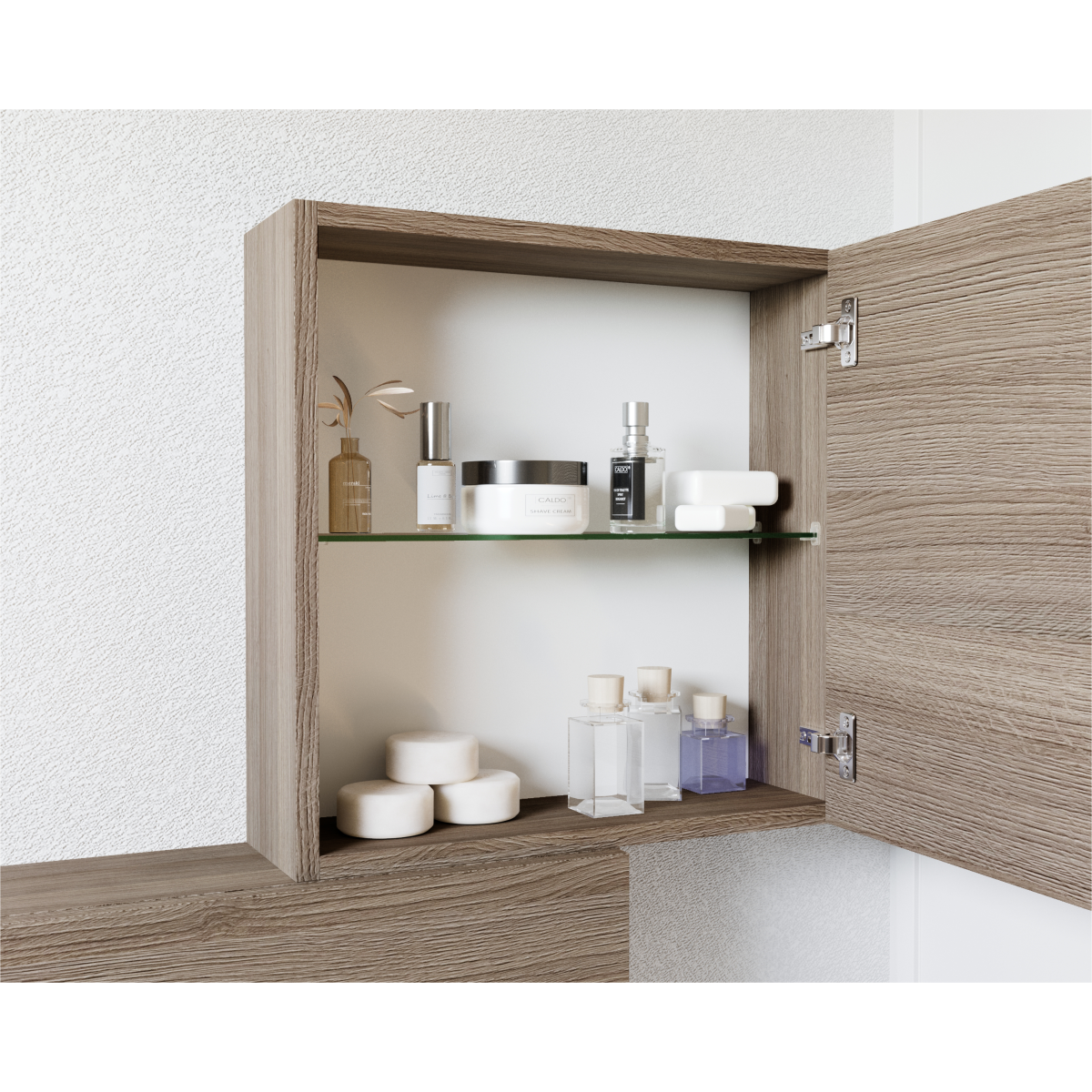 Kompakt mérete ellenére elegendő tárolóhelyet biztosít a legfontosabb piperecikkek számára, miközben a falra szerelhető kialakítás helytakarékos megoldást kínál. A természetes faerezetű felület világos, barátságos hangulatot teremt, az üvegpolc pedig elegánsan tagolja a belső teret.