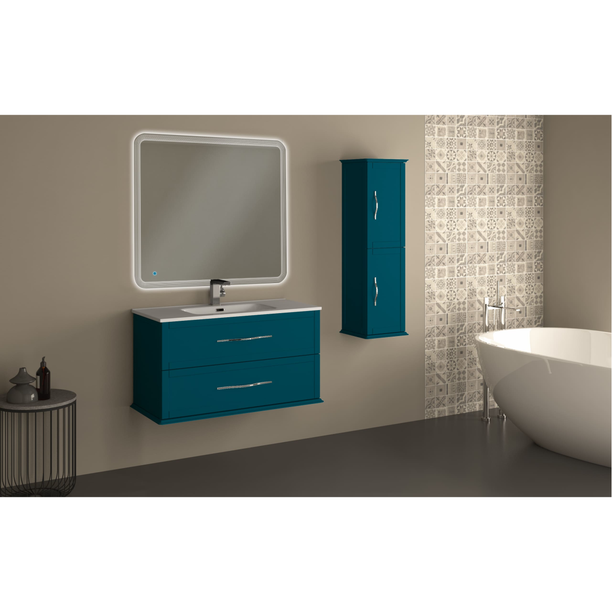 A bútor MDF anyagból készült, ami biztosítja a tartósságot és a könnyű tisztíthatóságot. Az olajkék színű felület modern és különleges hatást kelt, a fém (krómozott) fogantyúk pedig elegáns kontrasztot adnak a sötétebb árnyalathoz. A 2 ajtó mögött található üvegpolcok átlátható, higiénikus és praktikus tárolást biztosítanak, ideálisak törölközők, kozmetikumok vagy kisebb fürdőszobai eszközök elhelyezésére.