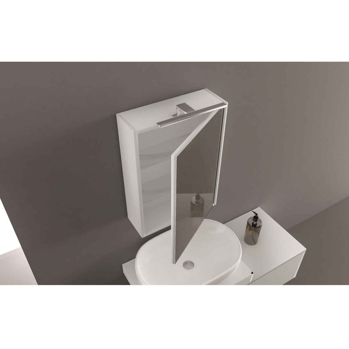 A beépített LED világítás segíti a mindennapi használatot, míg a tükrös ajtó és a belső polcos elrendezés praktikus tárolási lehetőséget biztosít a kisebb fürdőszobai kiegészítők számára. Kompakt méretének köszönhetően kisebb terekben is jól használható.