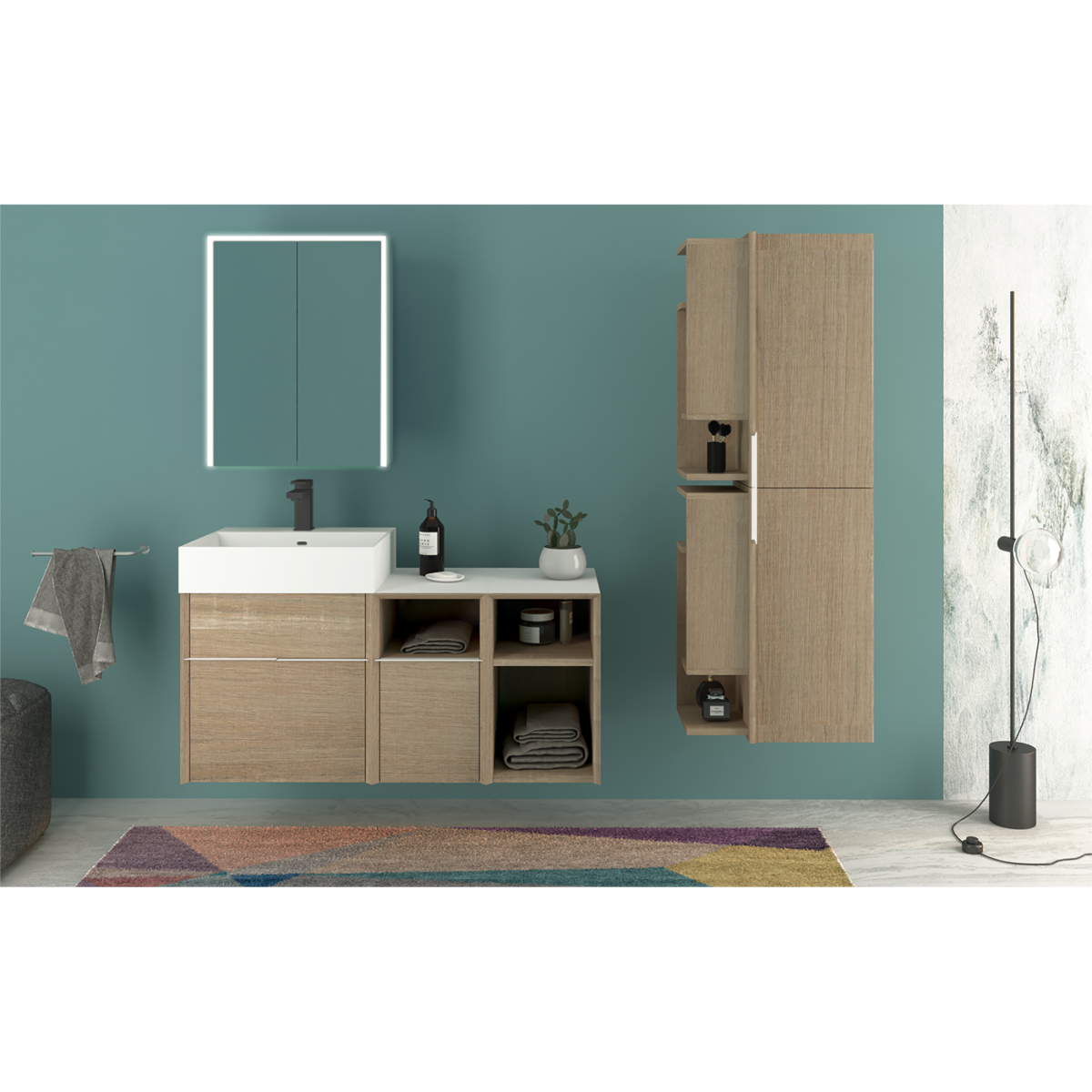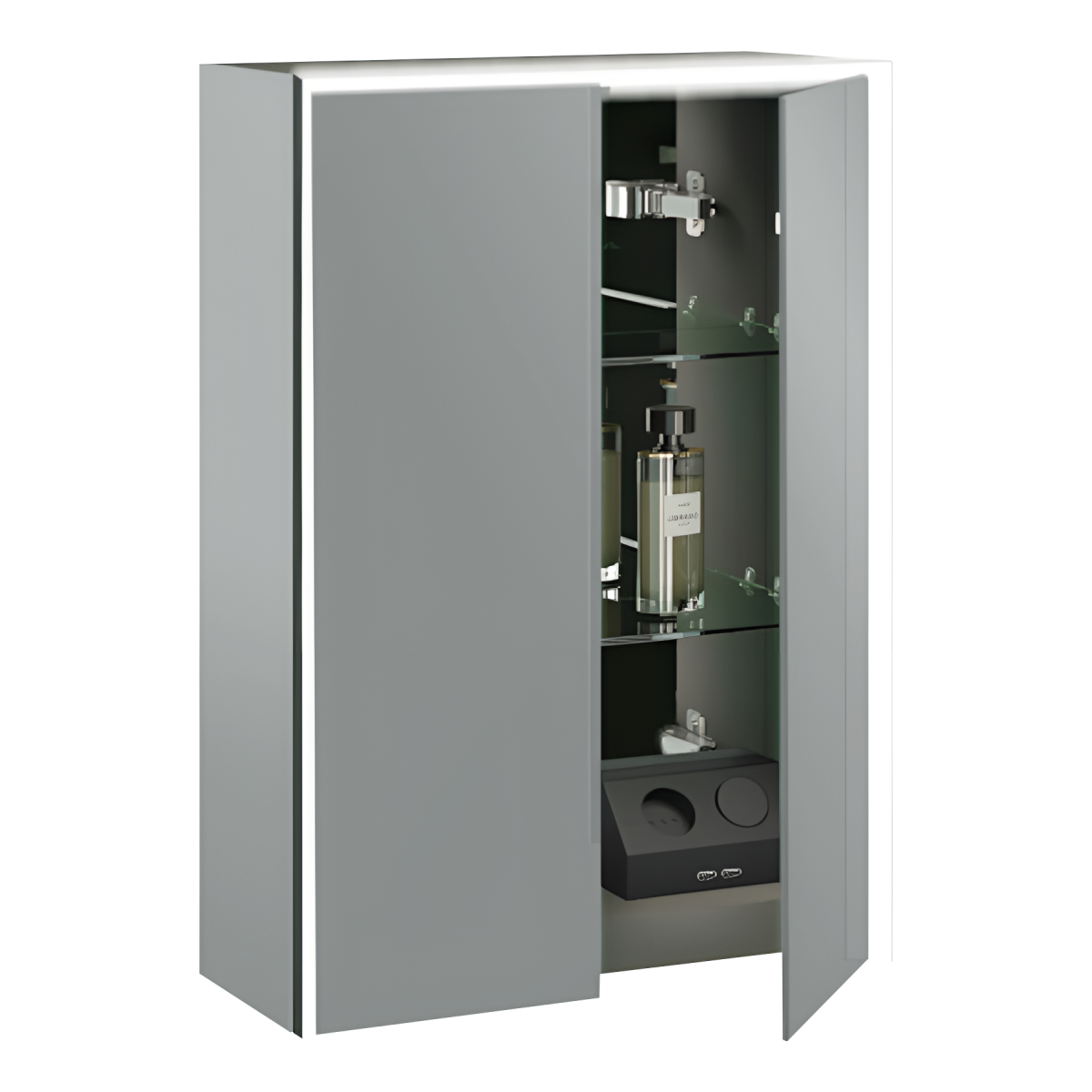 A beépített LED világítás egyenletes fényt biztosít a mindennapi használathoz,míg a fekete belső dizájn karakteres kontrasztot teremt, amely modern fürdőszobákban különösen jól érvényesül. A két ajtó mögött elhelyezett fekete üvegpolcok rendezett és jól átlátható tárolást tesznek lehetővé.