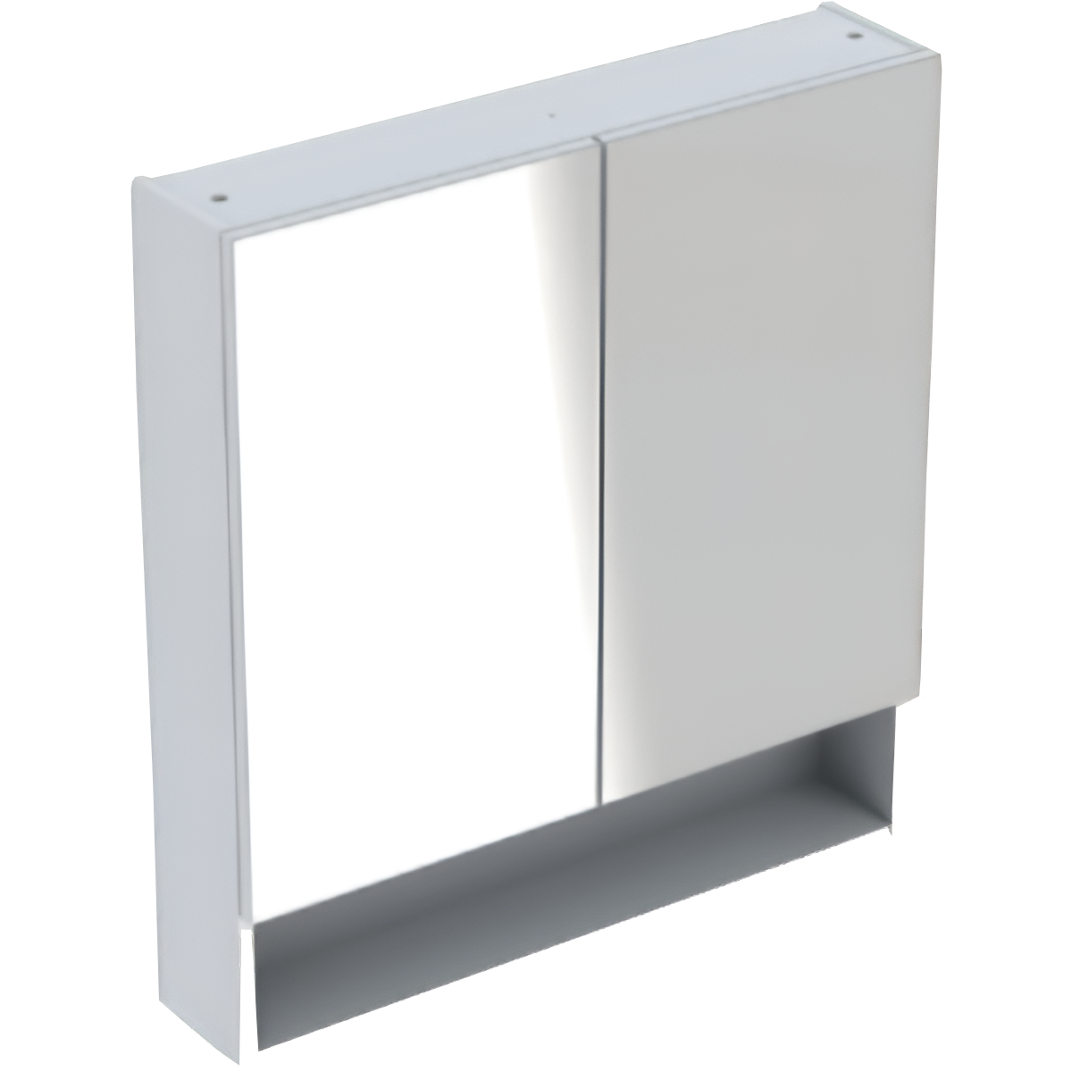 Geberit Selnova Square tükrös szekrény; falra szerelhető, két ajtóval, nyitott pakolófelülettel, ajtó csillapítómechanizmussal, négy áthelyezhető üvegpolccal.