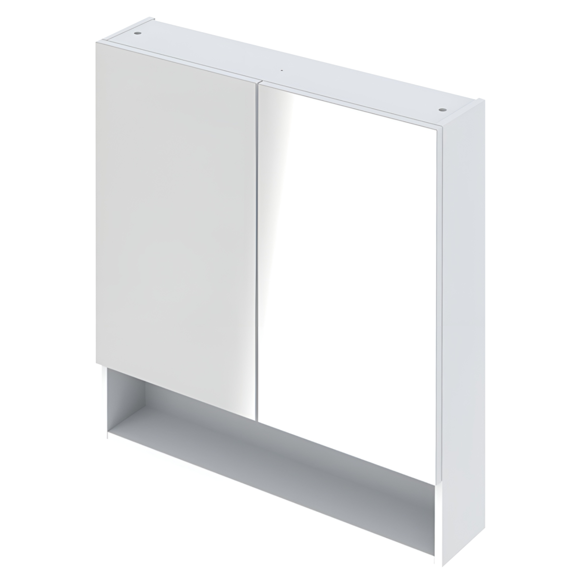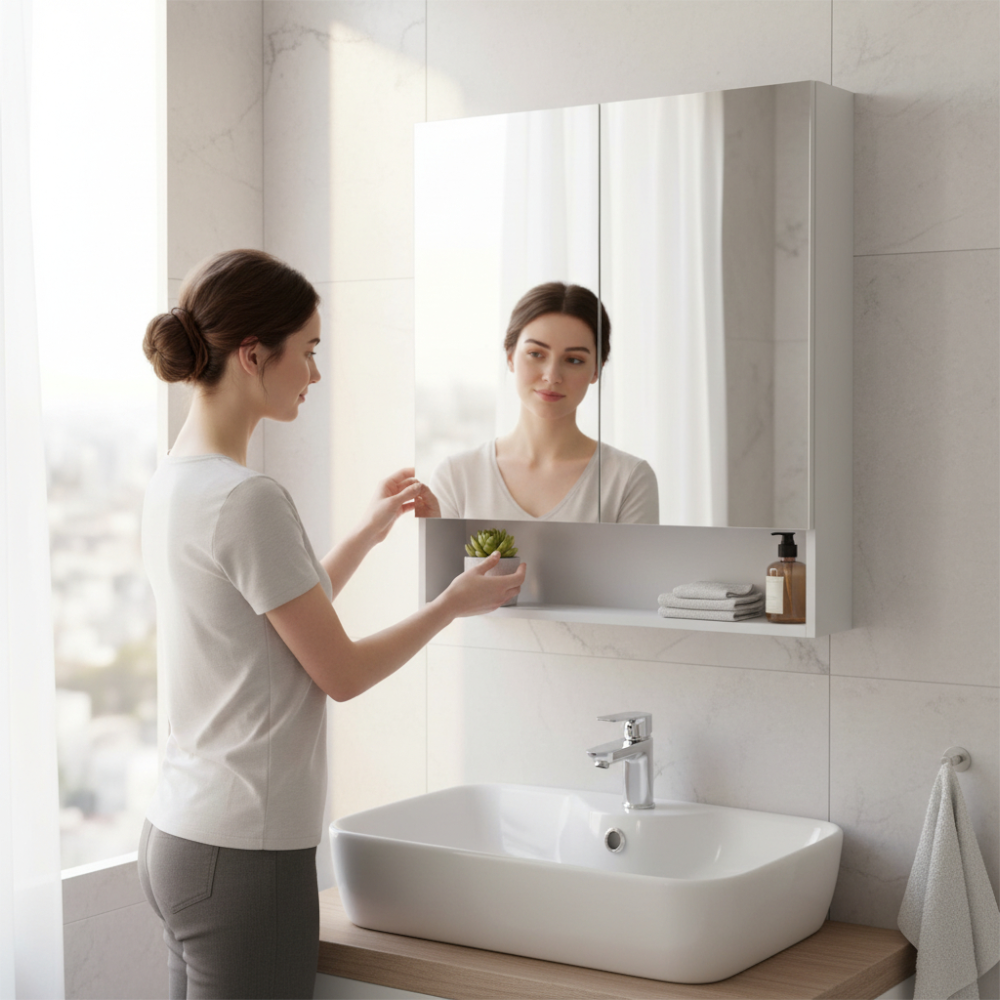 A kétajtós megoldás mögött bőséges belső tárolóhely áll rendelkezésre, míg az alsó, nyitott pakolófelület gyors hozzáférést biztosít a gyakran használt tárgyakhoz. Fehér színe letisztult megjelenést ad, könnyen kombinálható különböző fürdőszobai stílusokkal.