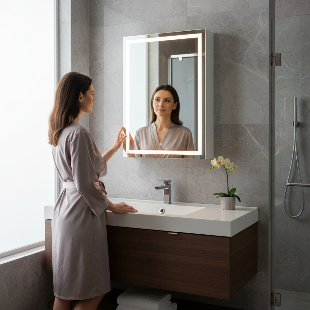 A beépített LED világítás érintőkapcsolóval működtethető, fényereje pedig igény szerint állítható. A belső térben elhelyezett MDF polcok segítenek rendszerezetten tárolni a piperecikkeket. A becsapódásgátlóval ellátott ajtó a kényelmesebb használatot szolgálja.