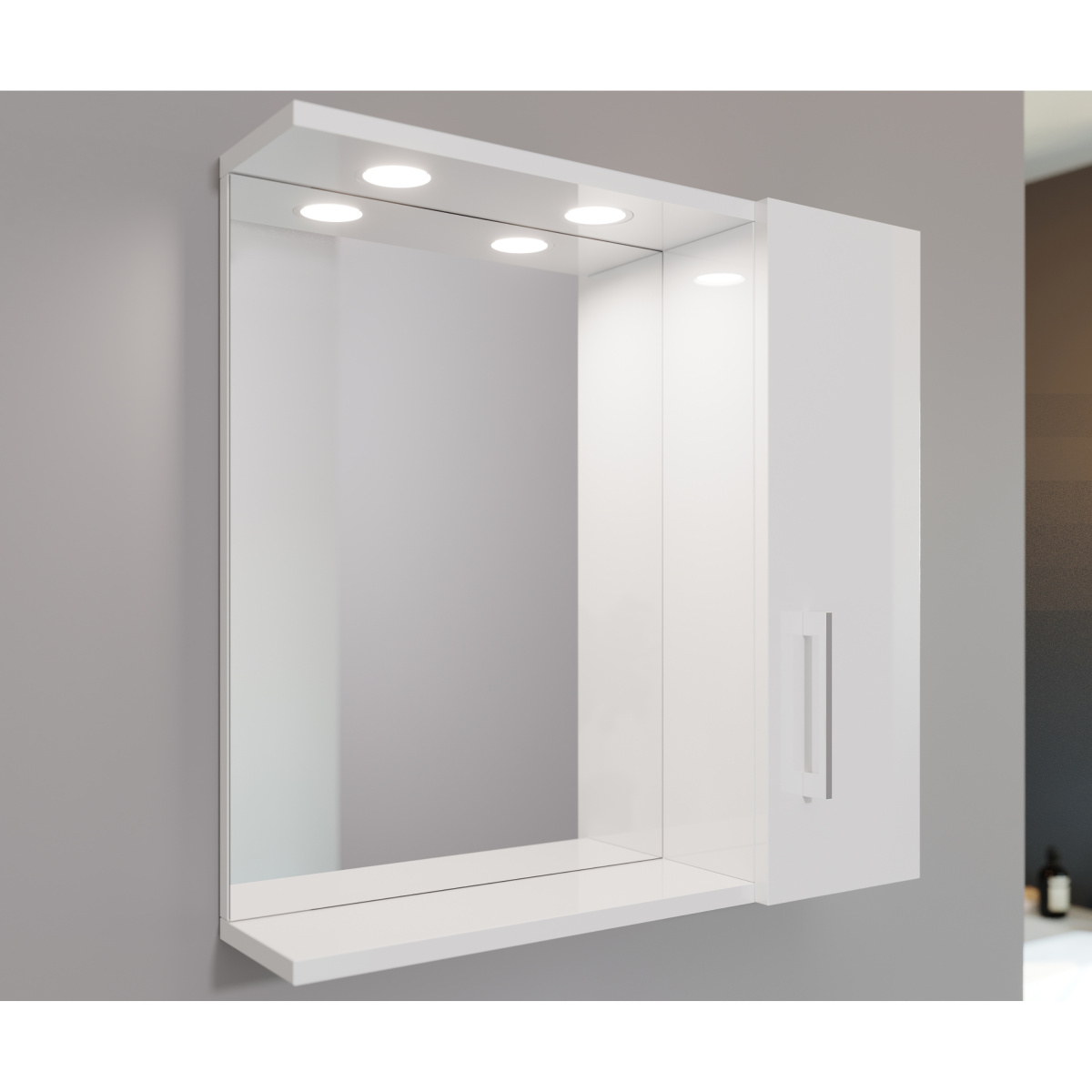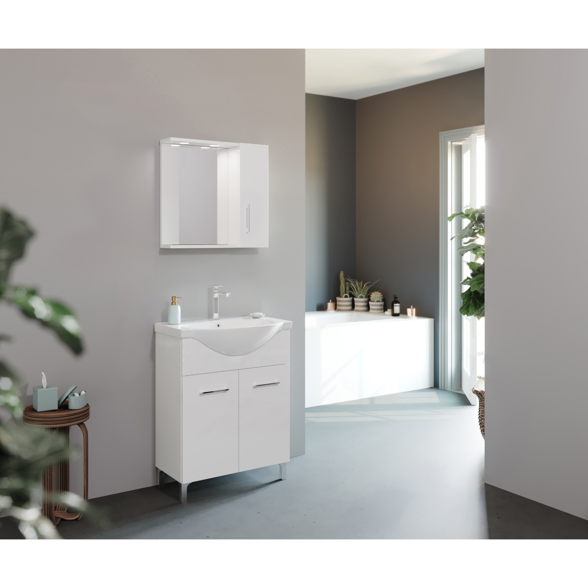 Vákuumpréselt, fóliázott, magasfényű felülete egységes és letisztult megjelenést ad a bútornak. A beépített, két darab spot LED világítás célzott fényt biztosít a mosdó feletti területen. A szekrény kialakítása a funkcionalitást és az egyszerű formavilágot helyezi előtérbe. Visszafogott megjelenése jól illeszthető különböző fürdőszobai stílusokhoz.