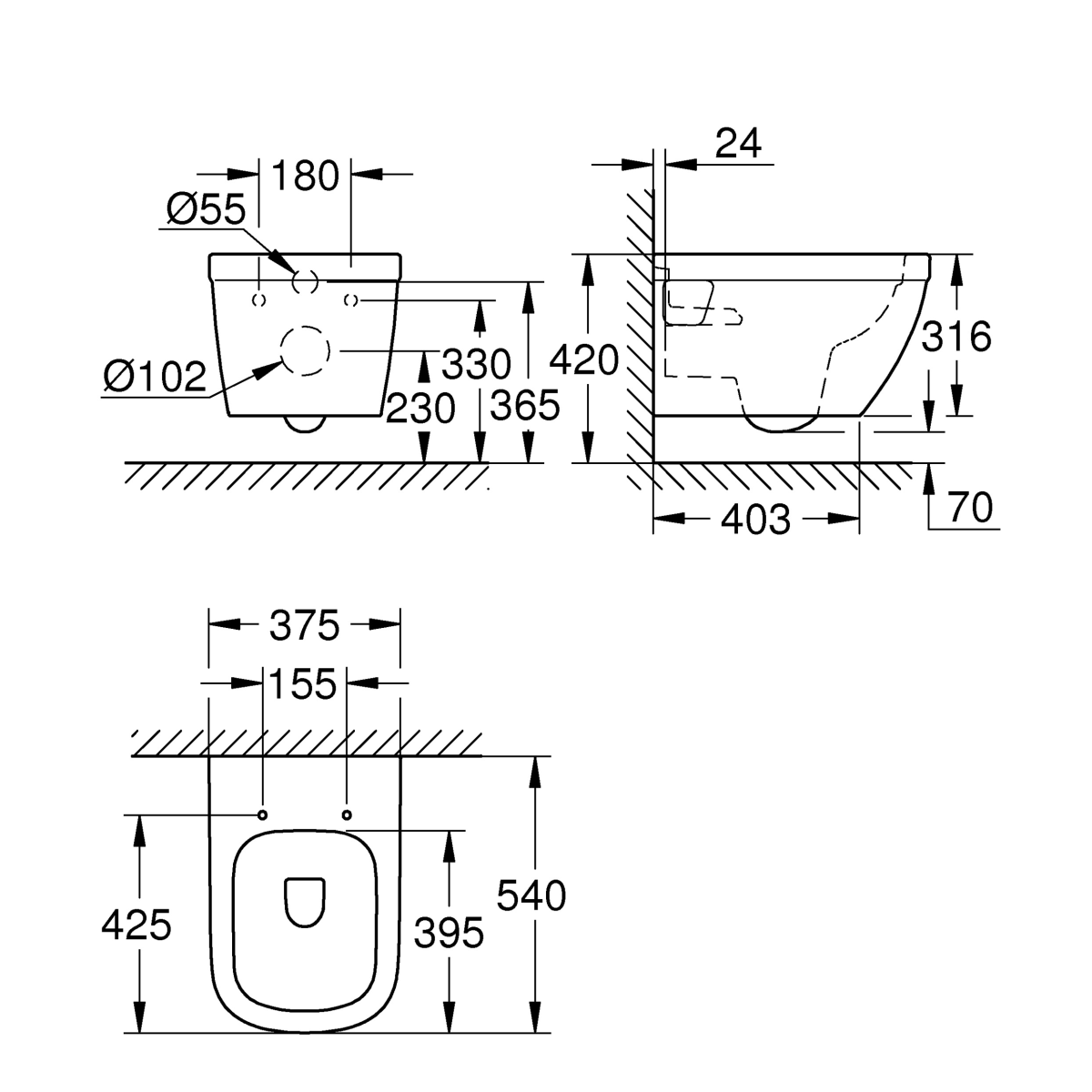 Grohe Euro Ceramic fali WC, falsík mögötti öblítőtartályhoz. Vízszintes kimenet, mély öblítéses, perem nélküli szaniter kerámia, öblítési mennyiség 3/5 liter.A 331507 és a 331506-os cikkszámokon található WC ülőkékkel kompatibilis.