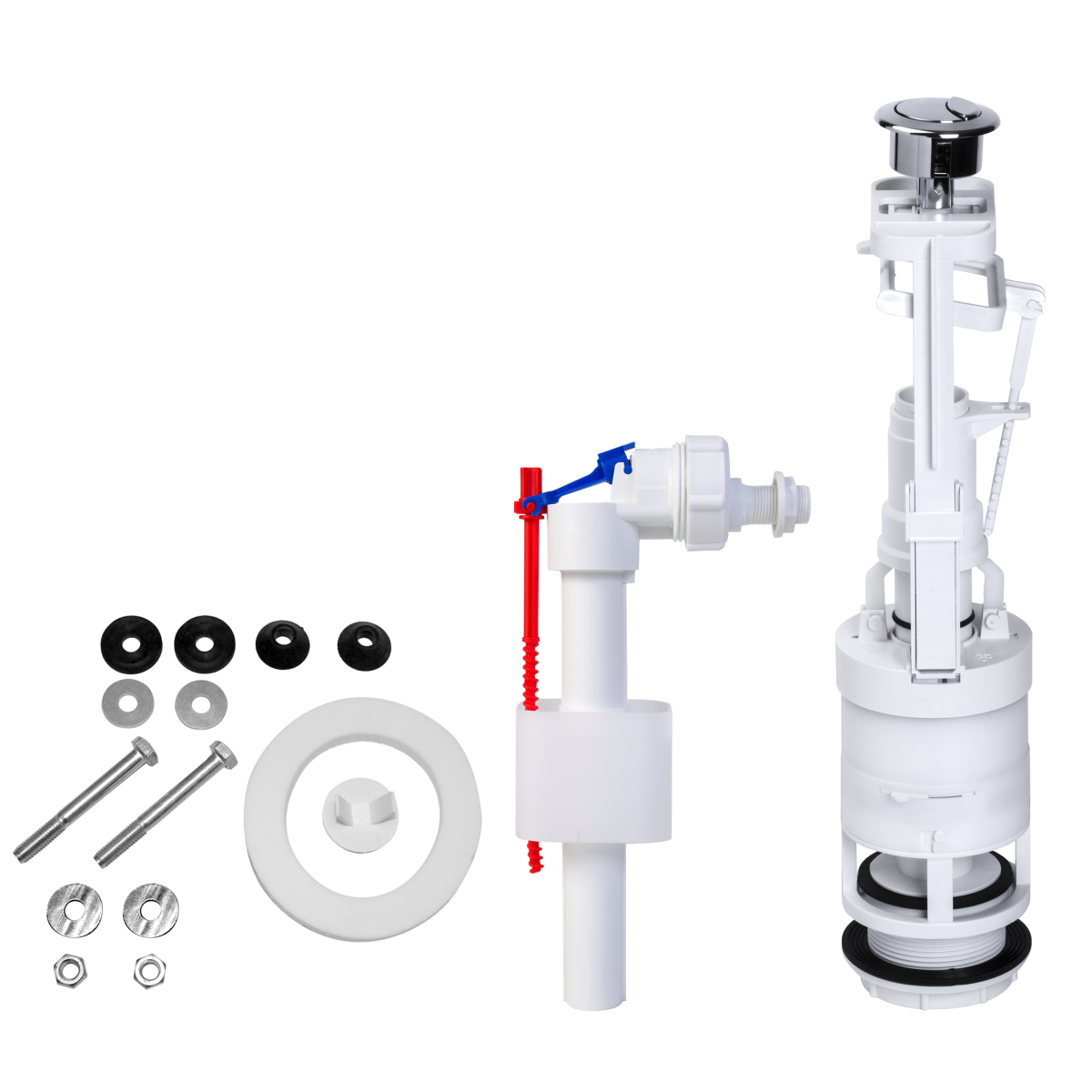 Monoblokkos egységcsomag: dupla gombos öblítőszelep + 3/8"-os műanyag menetes töltőszelep, szerelési egységcsomaggal.