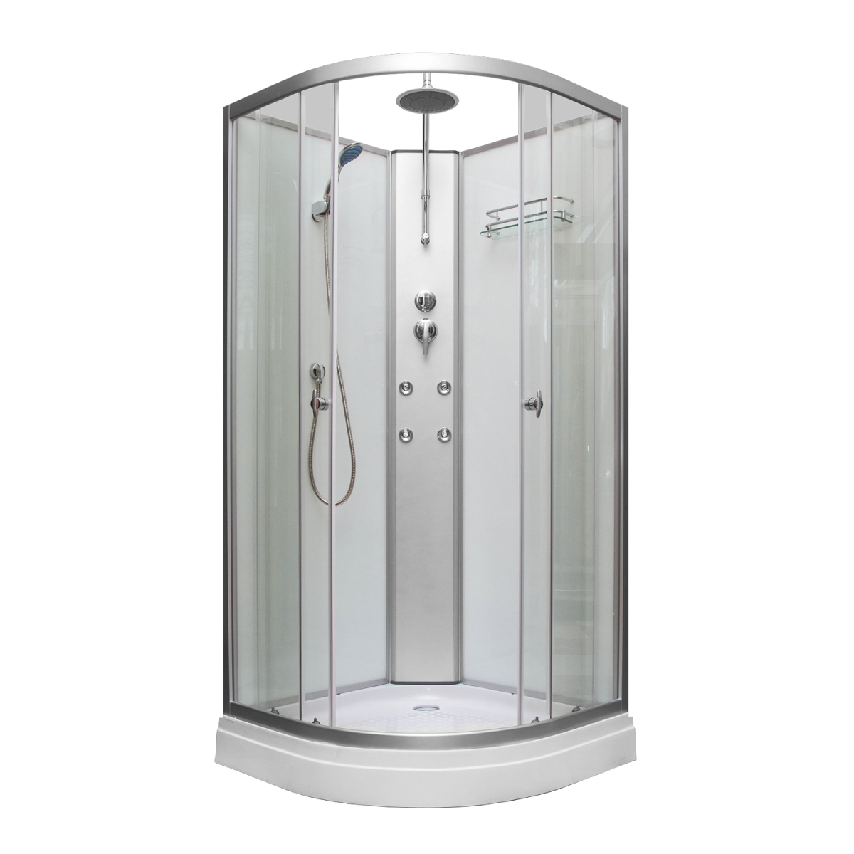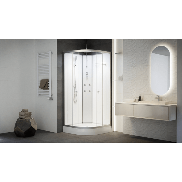 Hidromasszázs zuhanykabin - 4 mm-es, víztiszta biztonsági üvegek és ajtók - fehér üveg hátfalak - mattkróm alumínium ívek és profilok - mattkróm funkciós panel - mágneses ajtózár - görgős ajtónyitás - felső és kézi zuhany - 4 db hidromasszázs fúvóka - piperepolc - kerámiabetétes keverőszelep és funkcióváltó - leeresztőszelep - alacsony zuhanytálca - fehér akril - acélmerevítés, üvegszál erősítés - állítható fém lábak