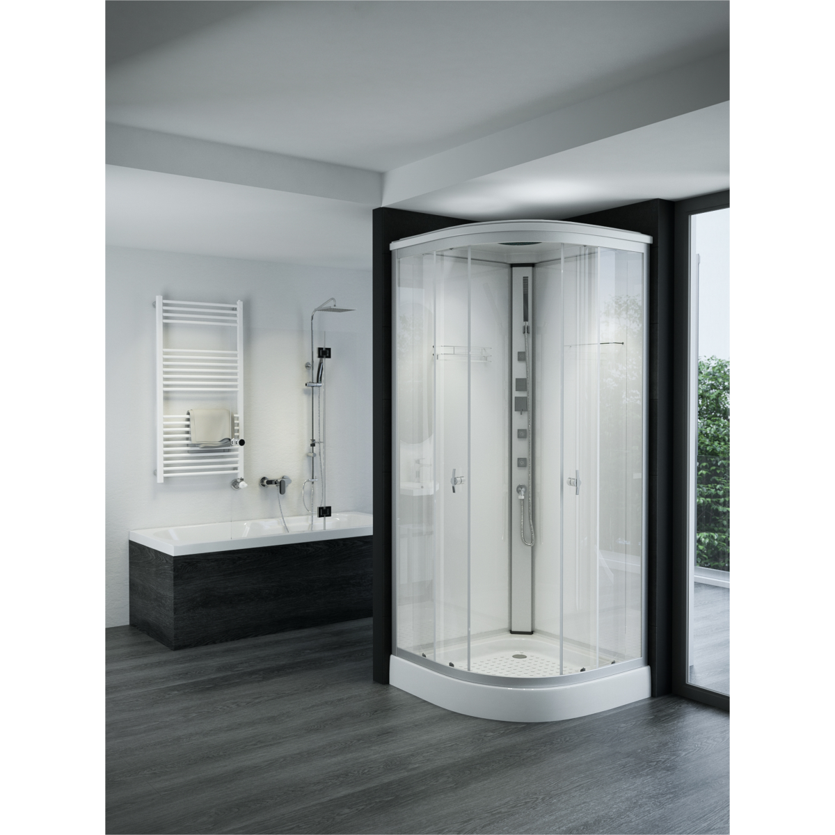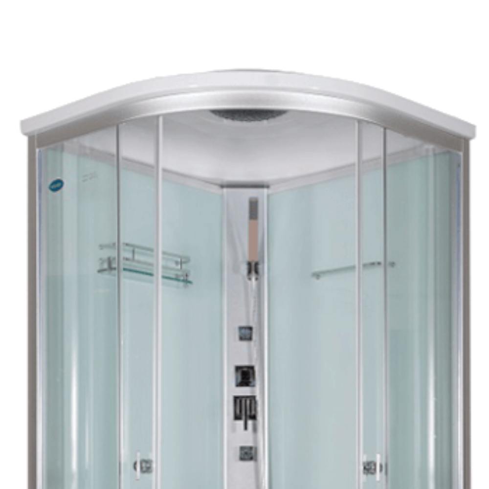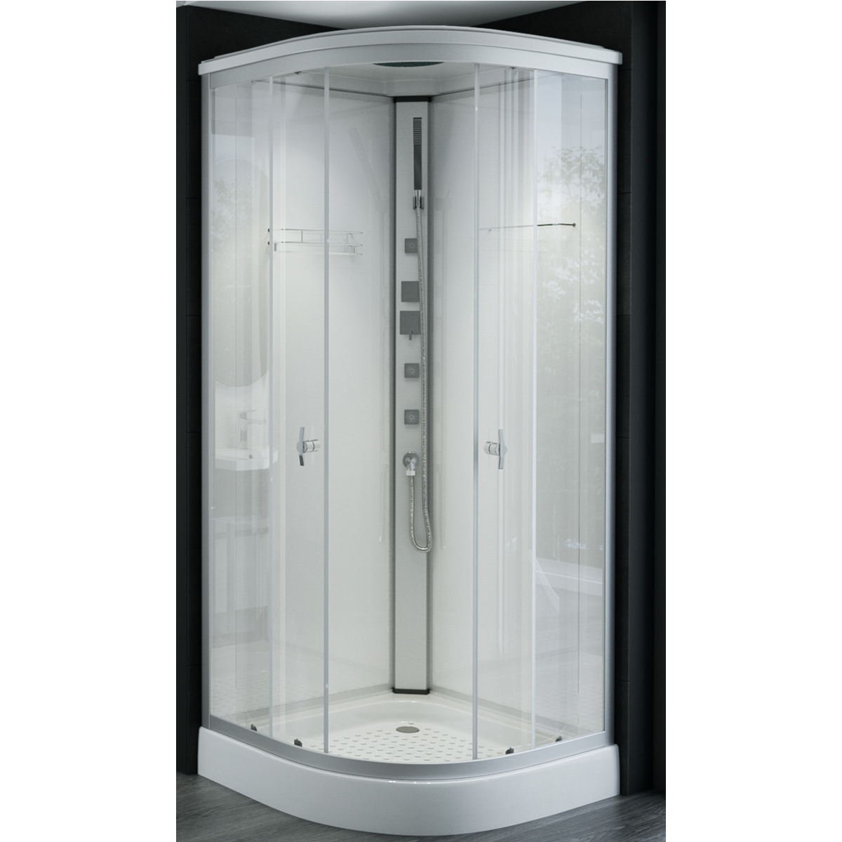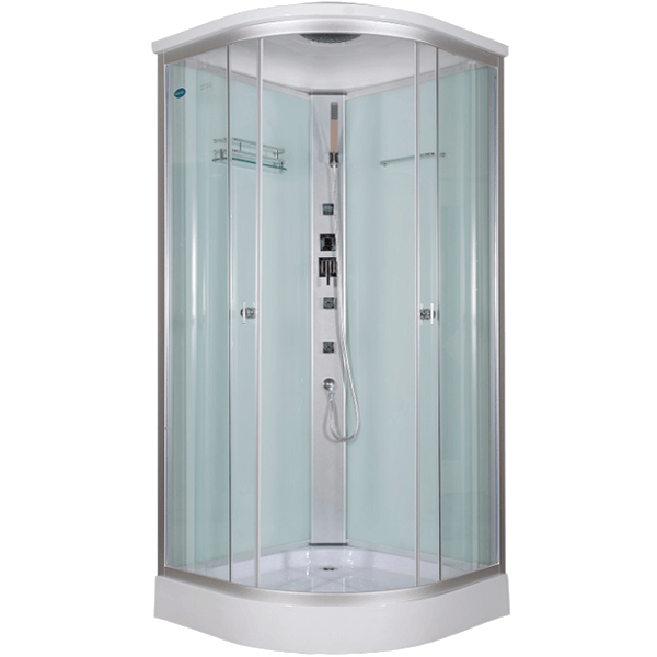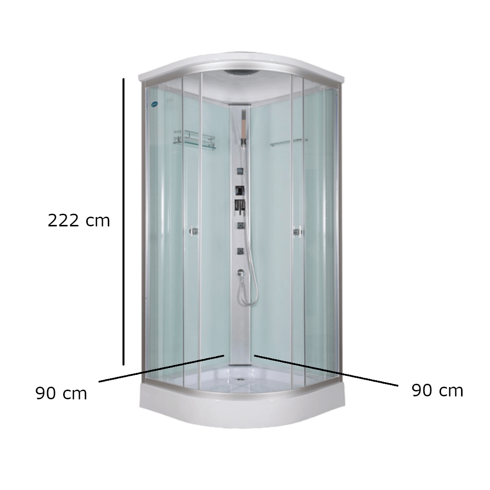 Negyedköríves hidromasszázs zuhanykabin 90x90x222cm, üvegszál erősítése, acél merevítésű, alacsony, akril zuhanytálca, állítható fém lábakkal, mattkróm alumíniumívek és profilok, 5 mm vastag víztiszta biztonsági üvegek és ajtó, fehér színű üveg hátfalak, mattkróm funkciós panel, 3 db hidromasszázs fúvóka, kézi zuhany, felső esőztető zuhany, kerámia betétes keverőszelep és funkció váltó, piperepolc, törölköző tartó rúd, mágneses ajtózár, görgős ajtónyitás, leeresztő szelep.