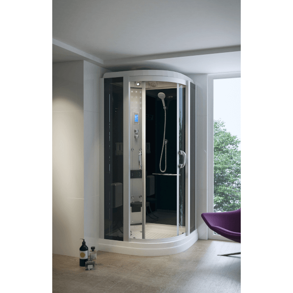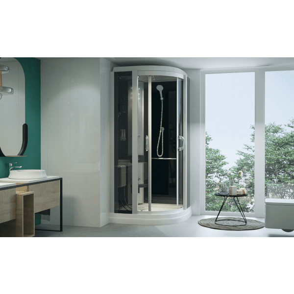 A Sanimix hidromasszázs zuhanykabin 90×90×215 cm modern, elektronikával felszerelt, komplett megoldás azok számára, akik a zuhanyzást valódi wellness élménnyé szeretnék emelni. A negyedköríves kialakítás helytakarékos, a fekete üveg hátfal és a sötétített biztonsági üvegek pedig karakteres, prémium megjelenést adnak a fürdőszobának. Az erőteljes hidromasszázs, a világítás és az extra kényelmi funkciók maximális komfortot biztosítanak a mindennapokban.