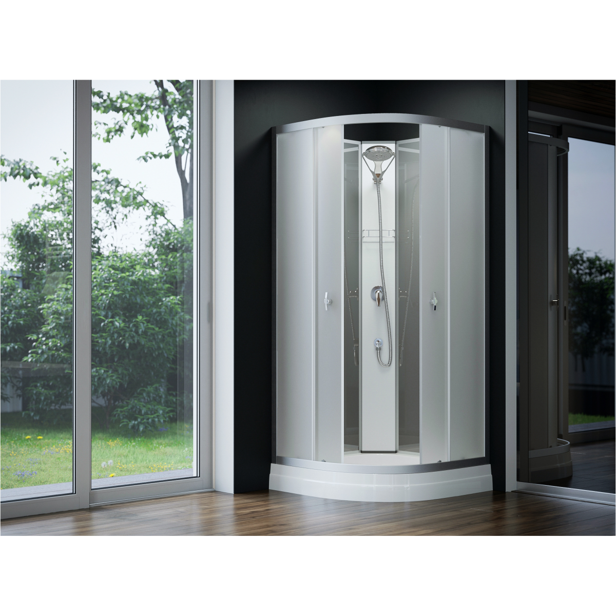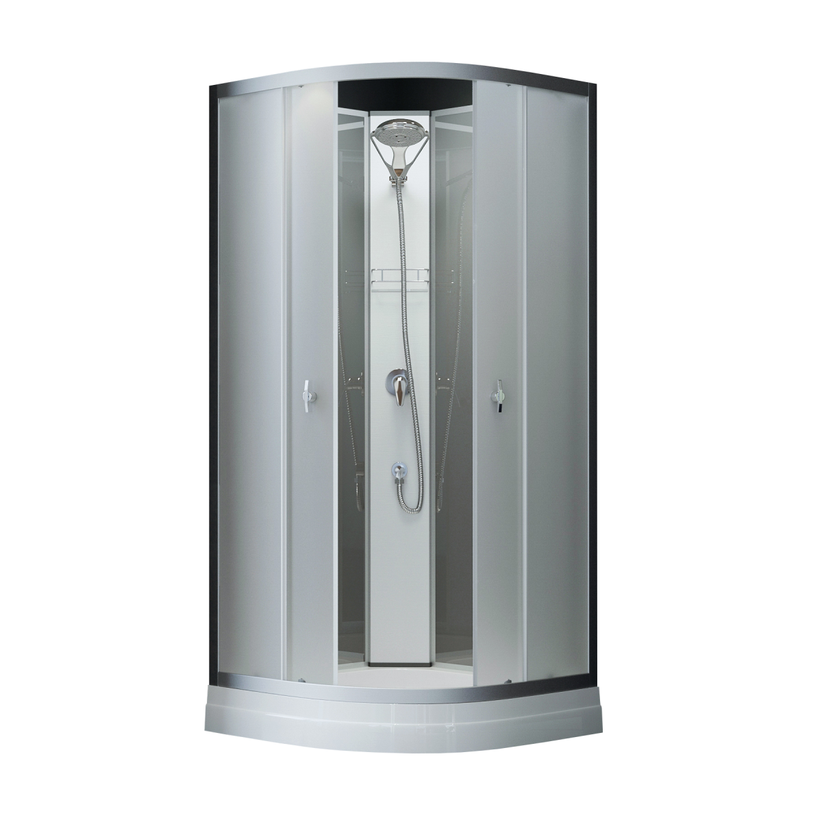 Sanimix Primo zuhanykabin. Elegáns megjelenésű, mégis helytakarékos és praktikus zuhanykabin akril tálcával. 5 mm vastag biztonsági üvegek és ajtók, melyek matt színezése intim teret biztosít anélkül, hogy teljesen elzárná a zuhanykabint. Mattkróm színű alumínium ívekkel és profilokkal. A görgős nyitású ajtó mágneszárral szerelt. Mérete: 200 cm x 90 cm x 90 cm. Zuhanytálcával együtt értékesítjük.