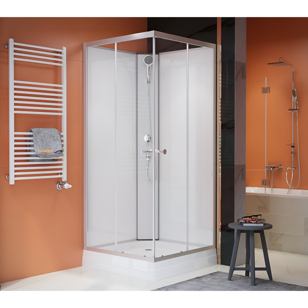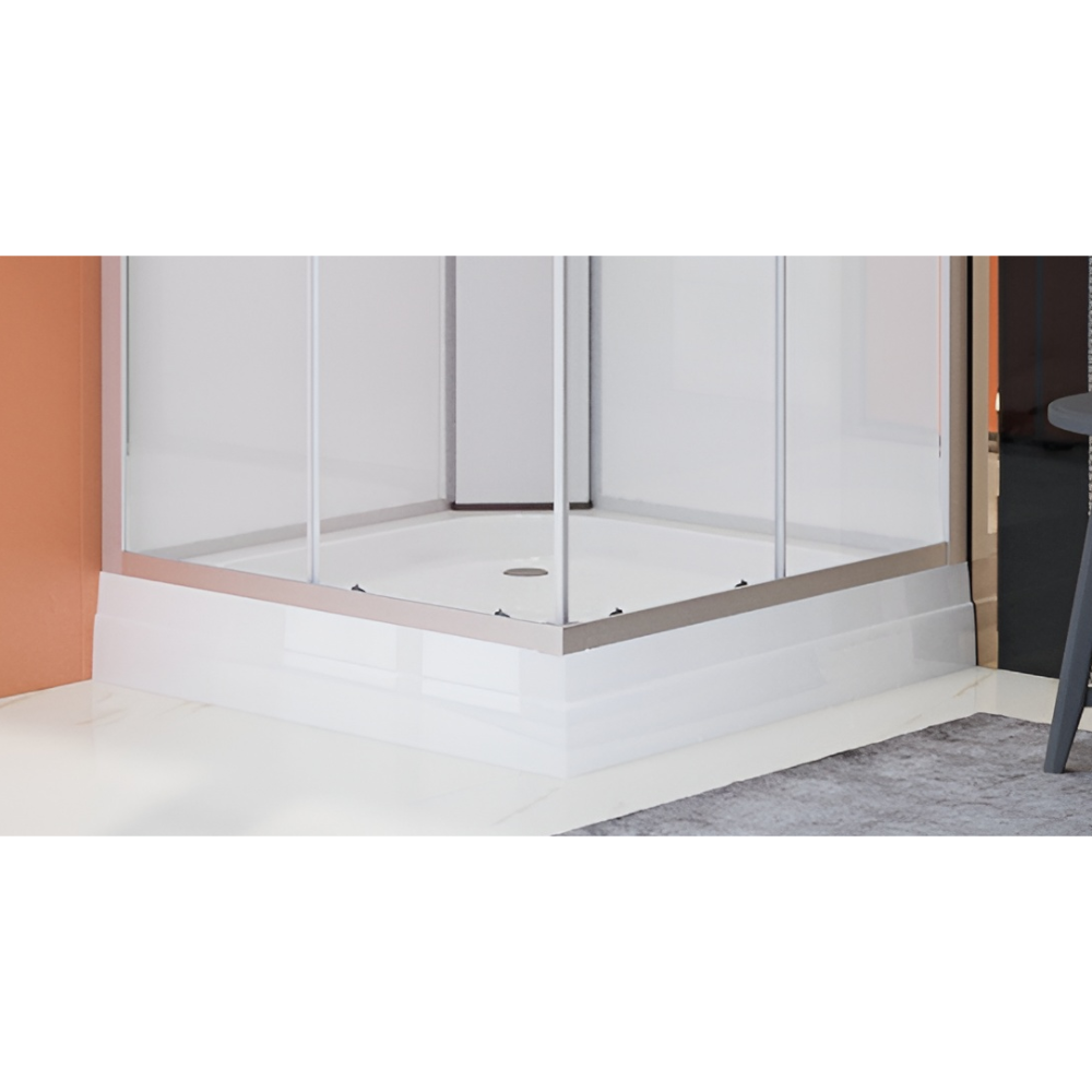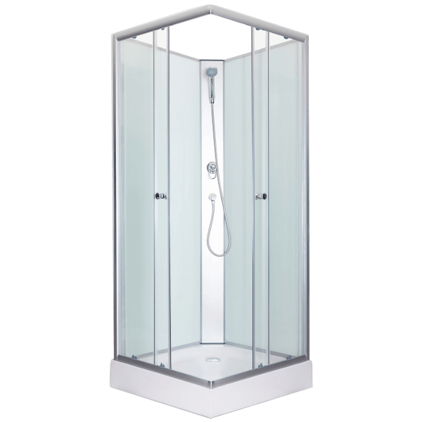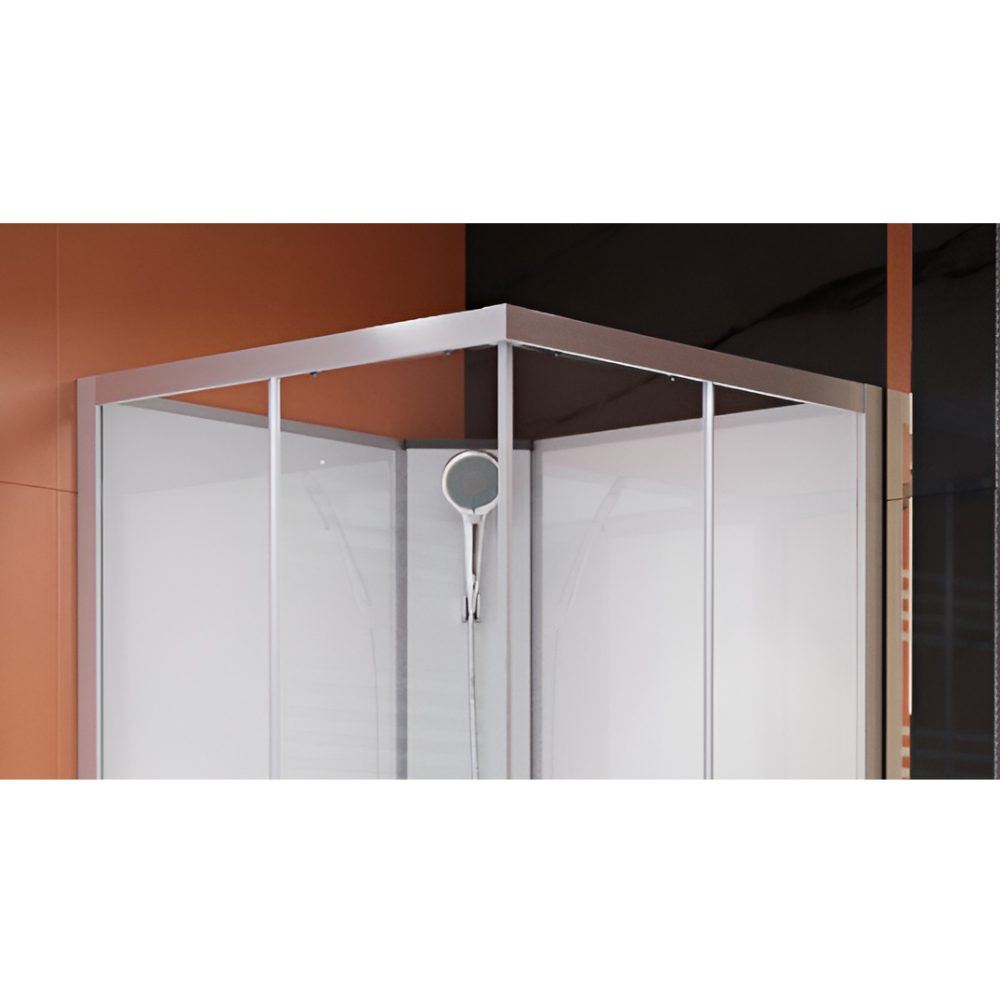 Sanimix szögletes zuhanykabin 90 cm x 90 cm x 200 cm-es méretben. Letisztult, modern zuhanykabin, ami minden fürdőszobába ideális választás. A matt króm profilokban elhelyezkedő 4 mm vastag, víztiszta biztonsági üvegek átengedik a fényt, így nem zárják el a zuhanykabint a fürdőszoba többi részétől. A dupla tolóajtó a görgők és krómozott fogantyúk segítségével könnyen nyitható. Üvegszál erősítéses, acél merevítésű, fehér színű alacsony zuhanytálcával, amihez állítható fém lábak is tartoznak. A fehér színű üveg hátfalak egységes és tiszta megjelenést kölcsönöznek a zuhanykabinnak. Matt króm funkciós panellel, kézi zuhanyfejjel és zuhanyfej tartóval.
