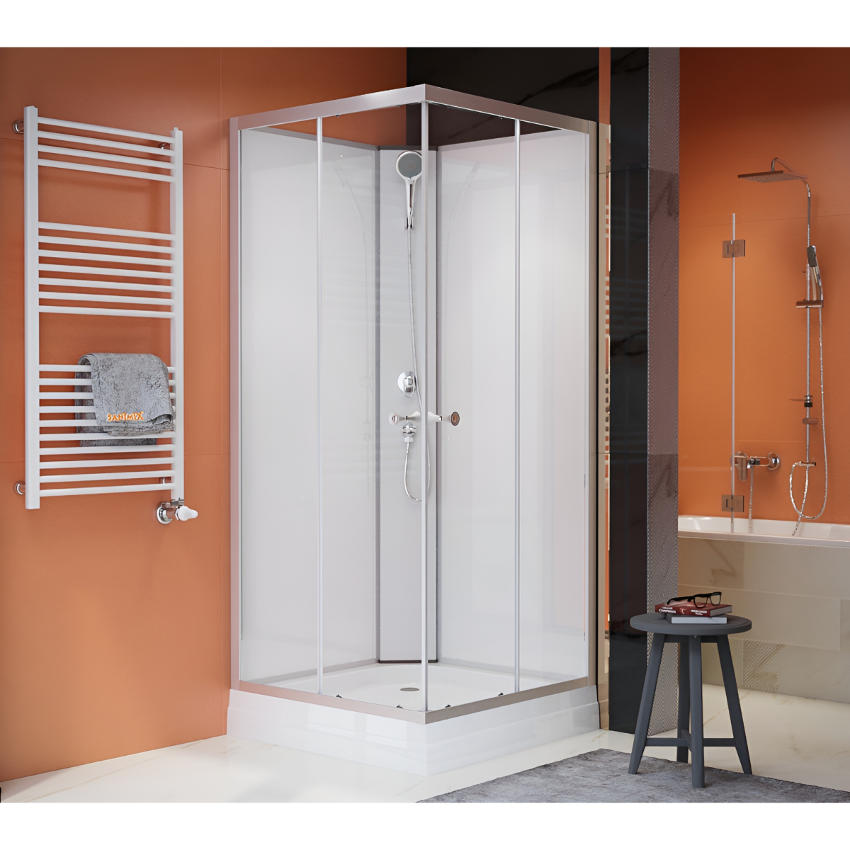 A Sanimix zuhanykabin 90×90×200 cm szögletes kialakításával klasszikus és praktikus választás a fürdőszobába. A tálcával ellátott kivitel azonnali, komplett megoldást kínál, míg a 4 mm vastag, víztiszta edzett biztonsági üvegek és ajtók könnyed, letisztult megjelenést biztosítanak. A fehér üveg hátfal világos összhatást ad, a mattkróm alumínium ívek és profilok pedig modern stílust képviselnek. A kézi zuhanyfej és a zuhanyfejtartó a mindennapi kényelmet szolgálja.