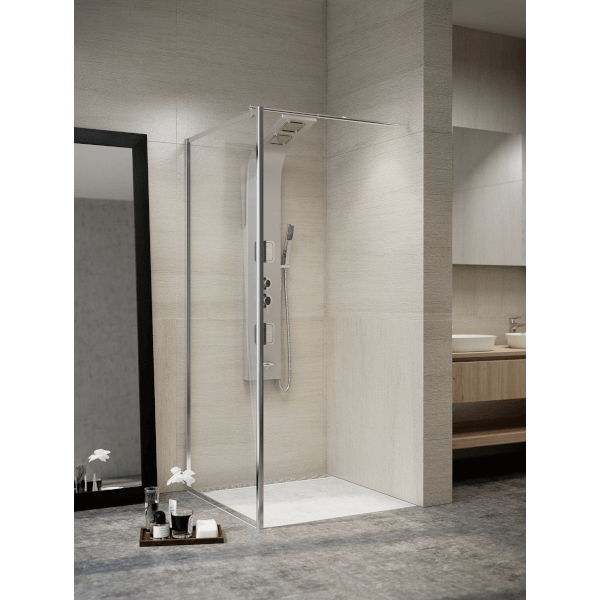 Zuhanyfal 5 mm-es biztonsági és víztiszta üveggel, krómozott alumínium kerettel, sarokelemekkel rendelkezik, mely segíti a zuhanyajtó hozzáépítését. Mérete: 90x185cm.