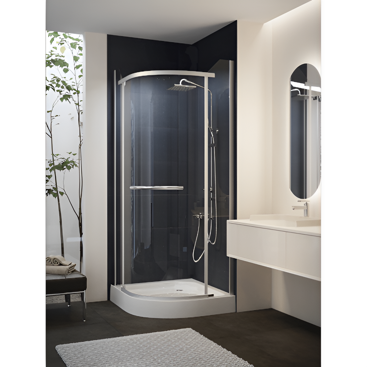 Sanimix negyedköríves zuhanykabin 90 cm x 90 cm x 195 cm-es méretben. Elegáns, modern zuhanykabin, megjelenésével minden fürdőszoba központi elemévé válhat. A matt ezüst profilban elhelyezkedő 6 mm vastag, víztiszta biztonsági üveg teljesen átengedi a fényt. A szimpla nyílóajtó a törölközőtartós króm fogantyú segítségével könnyen nyitható, míg a mágneszár gondoskodik a biztos záródásról. Jobbos-balos szerelhetőség. Zuhanytálca nélkül értékesítjük!
