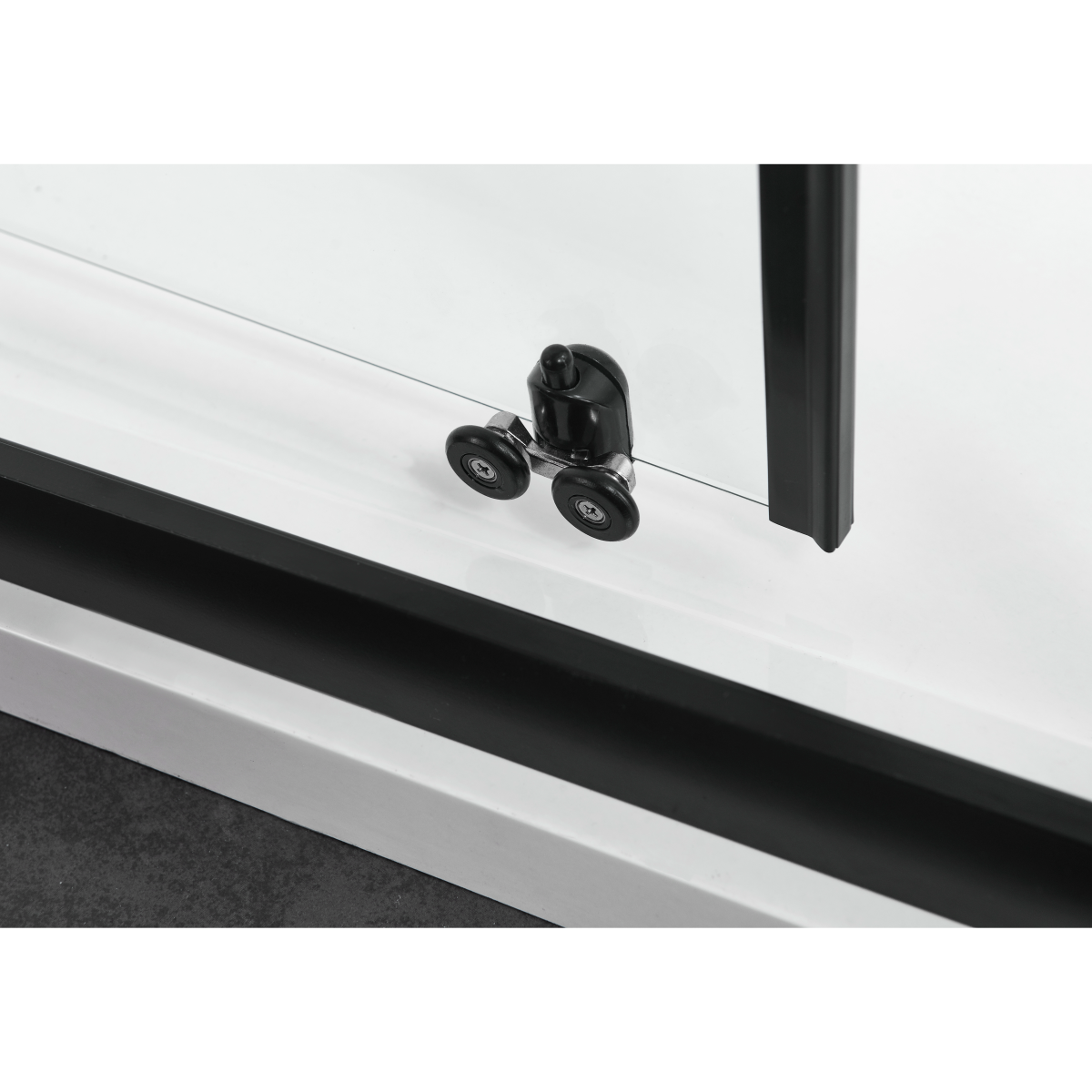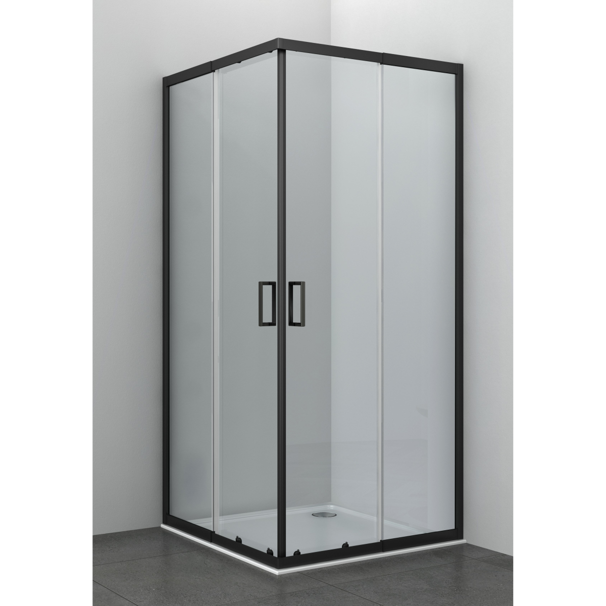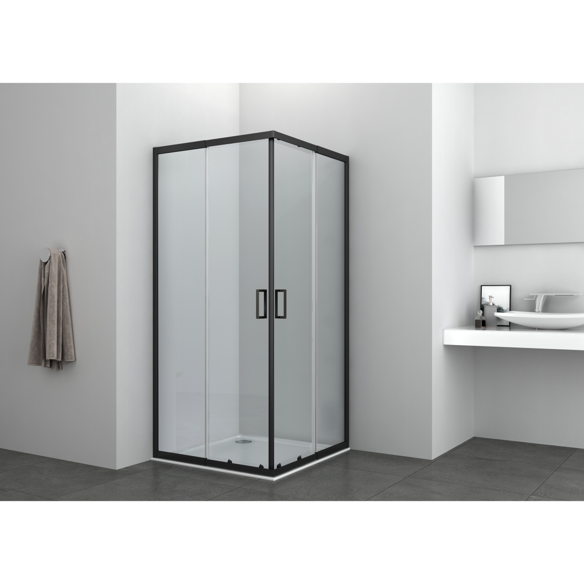 Sarokkabin két tolóajtóval, 5 mm-es edzett biztonsági üveggel és matt fekete, állítható fali profilokkal. A vezetősínek speciális kiképzése miatt mindkét ajtószárny 78–88 cm között állítható, így 80×80 cm-es vagy 90×90 cm-es zuhanytálcára – sőt aszimmetrikus méretre is – illeszthető.