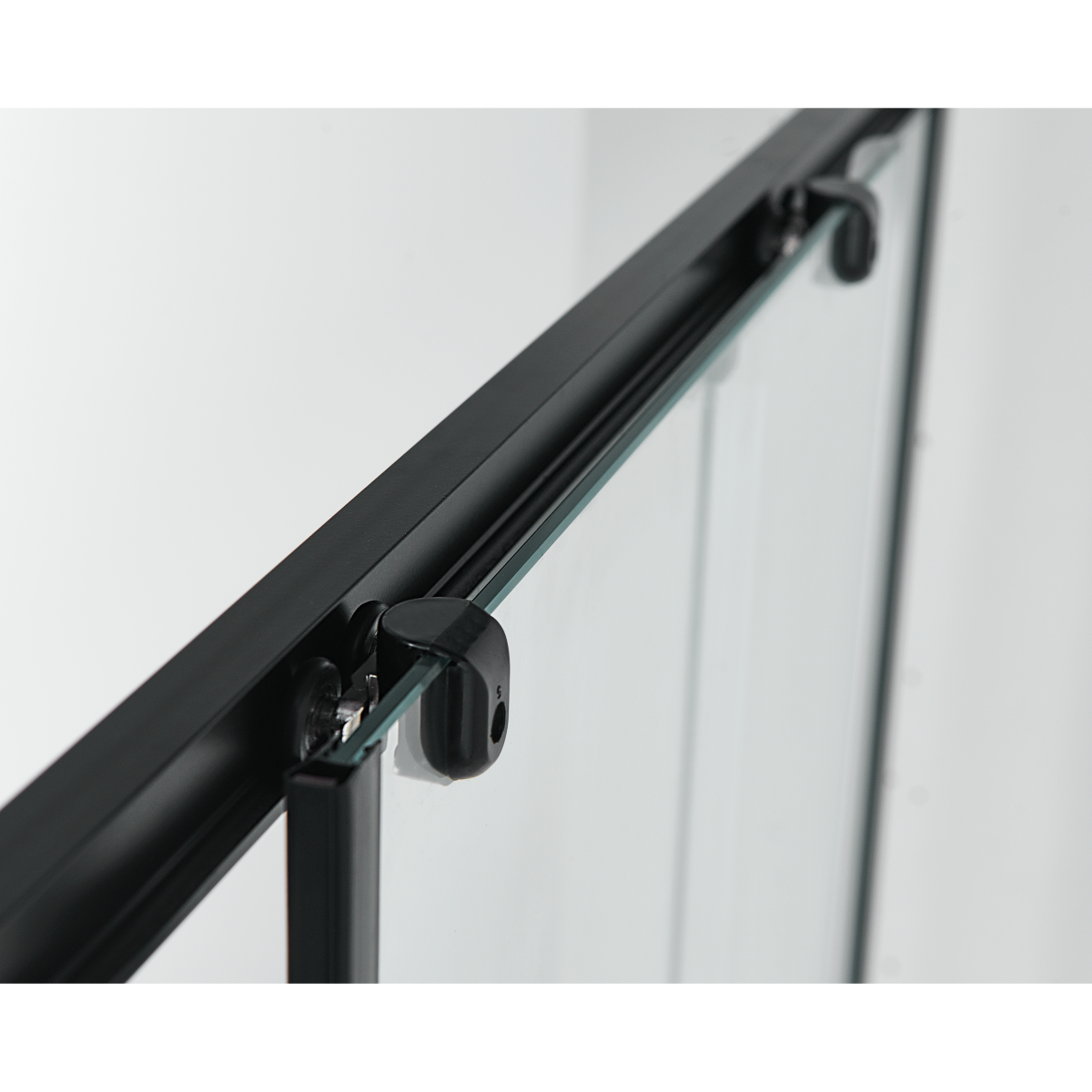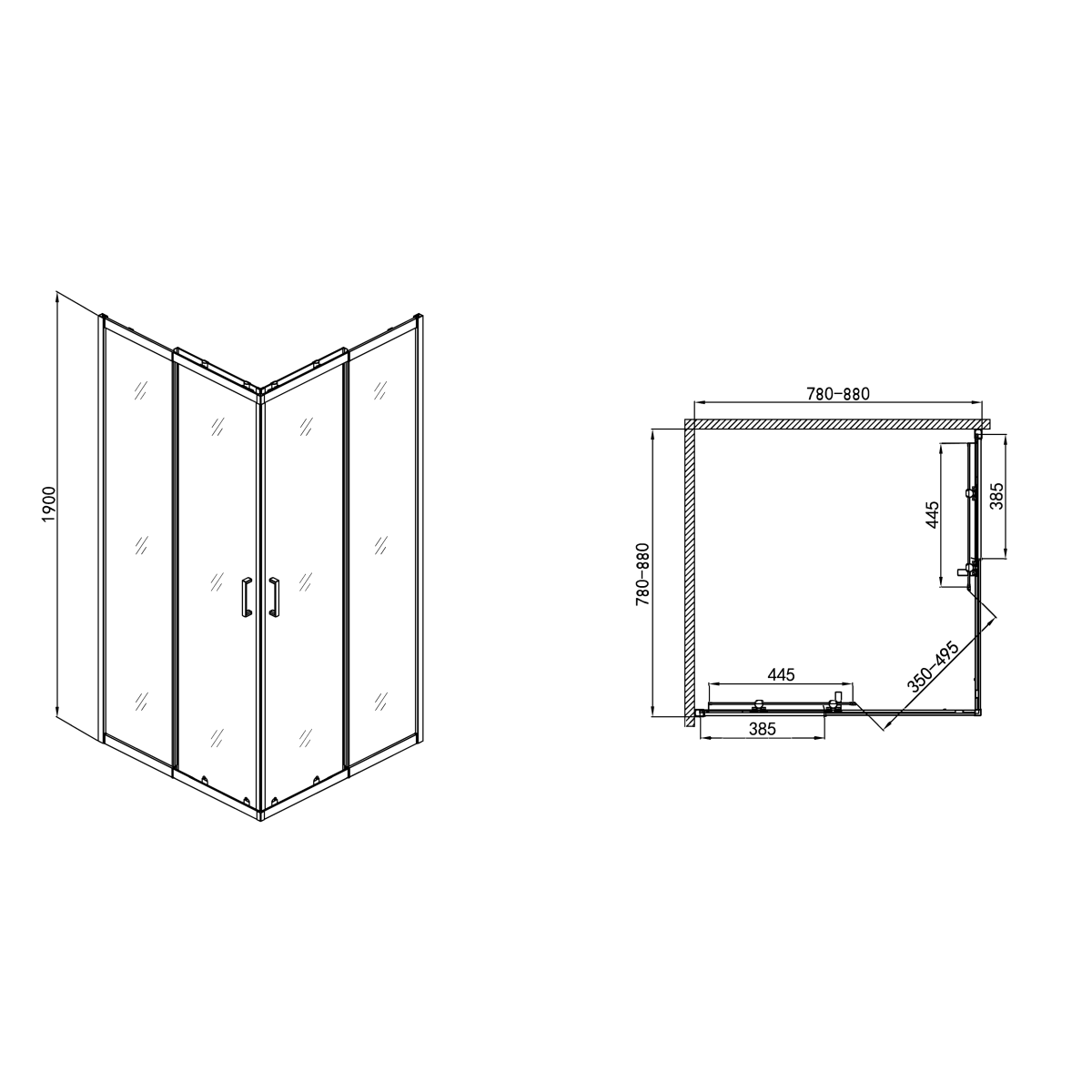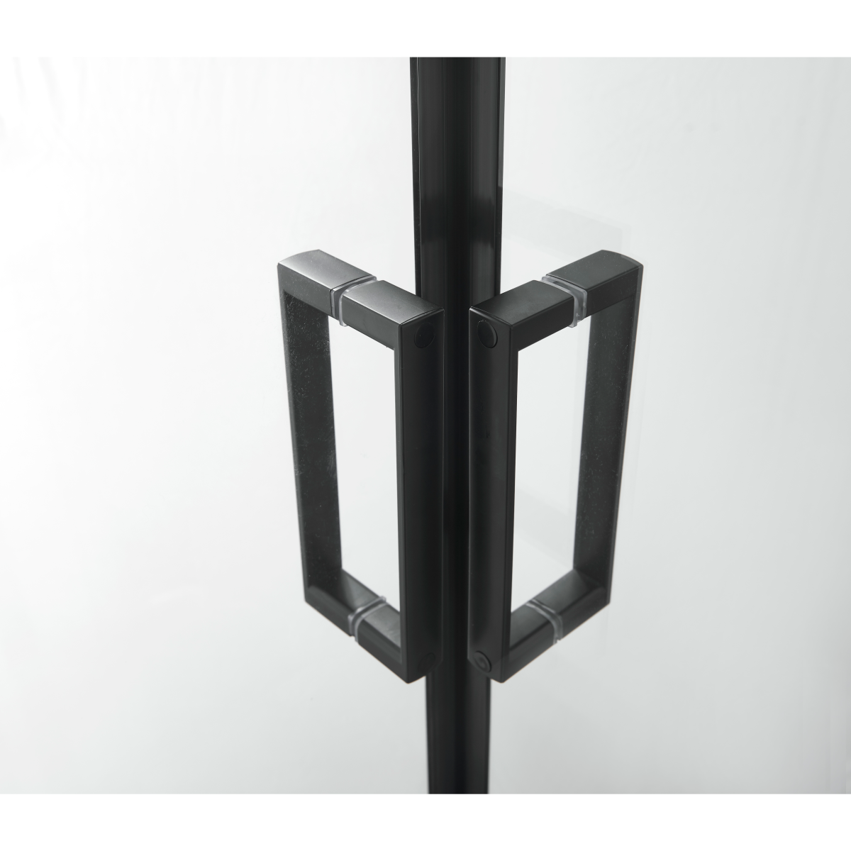 Sarokkabin két tolóajtóval, 5 mm-es edzett biztonsági üveggel és matt fekete, állítható fali profilokkal. A vezetősínek speciális kiképzése miatt mindkét ajtószárny 78–88 cm között állítható, így 80×80 cm-es vagy 90×90 cm-es zuhanytálcára – sőt aszimmetrikus méretre is – illeszthető.