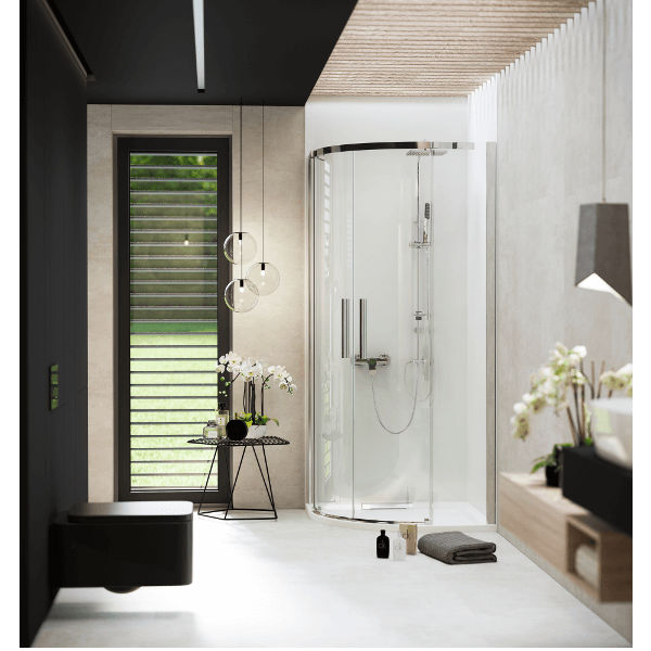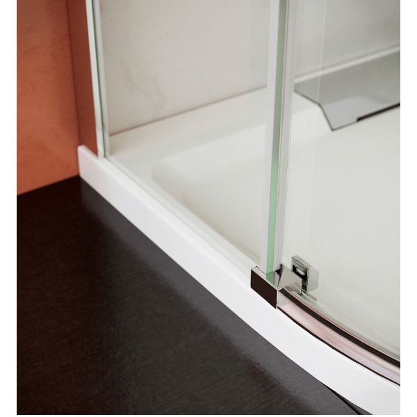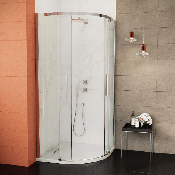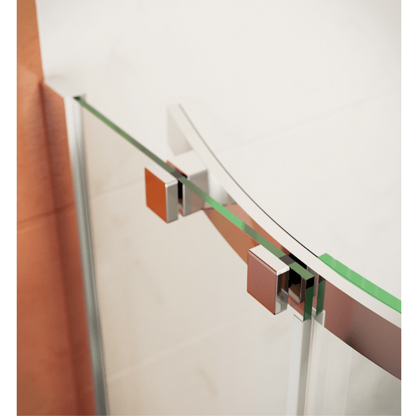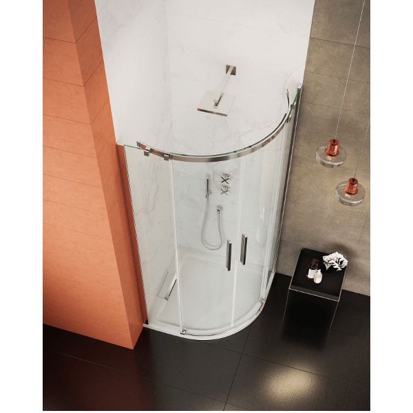 Professzionális fürdőberendezés, mérete: 90x195 cm (beépítési méret: 86-90 cm) 8 mm víztiszta, edzett biztonsági üveg, vízlepergető NANO bevonat a könnyebb tisztíthatóság érdekében, úszó kivitel görgők csak a felső profilban, alacsony zajszintű rozsdamentes acél dupla görgők, kisiklás elleni védelemmel, rejtett alsó vezetőgörgő, kiváló minőségű alumínium profilok, speciális, az ajtó ívét követő vezetősín a csendes és könnyű nyithatóságért, állítható méret, fém fogantyúk.