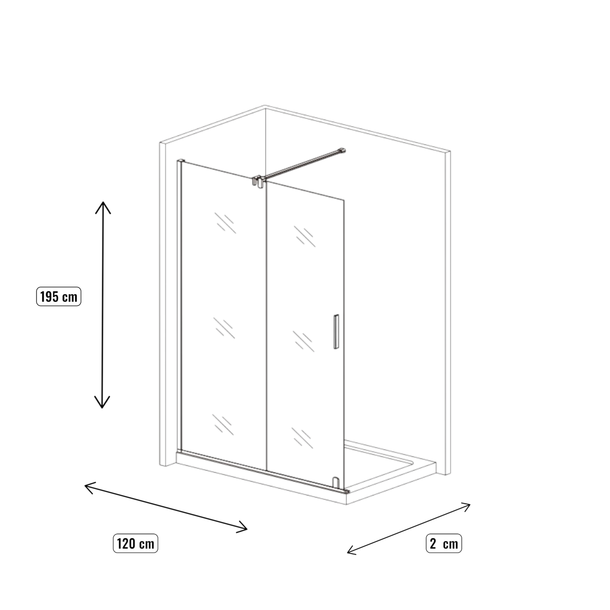 Zuhanyajtó 120x195 cm méretben, (beépítési méret: 116-120 cm), 8 mm víztiszta, edzett biztonsági üveg, vízlepergető NANO bevonat a könnyebb tisztíthatóság érdekében. Alul elhelyezett görgők, kiváló minőségű krómozott alumínium profilok, fém fogantyúk, jobb és baloldali szerelhetőség, állítható méret; két fal közé és önállóan Walk-in módon is beépíthető.