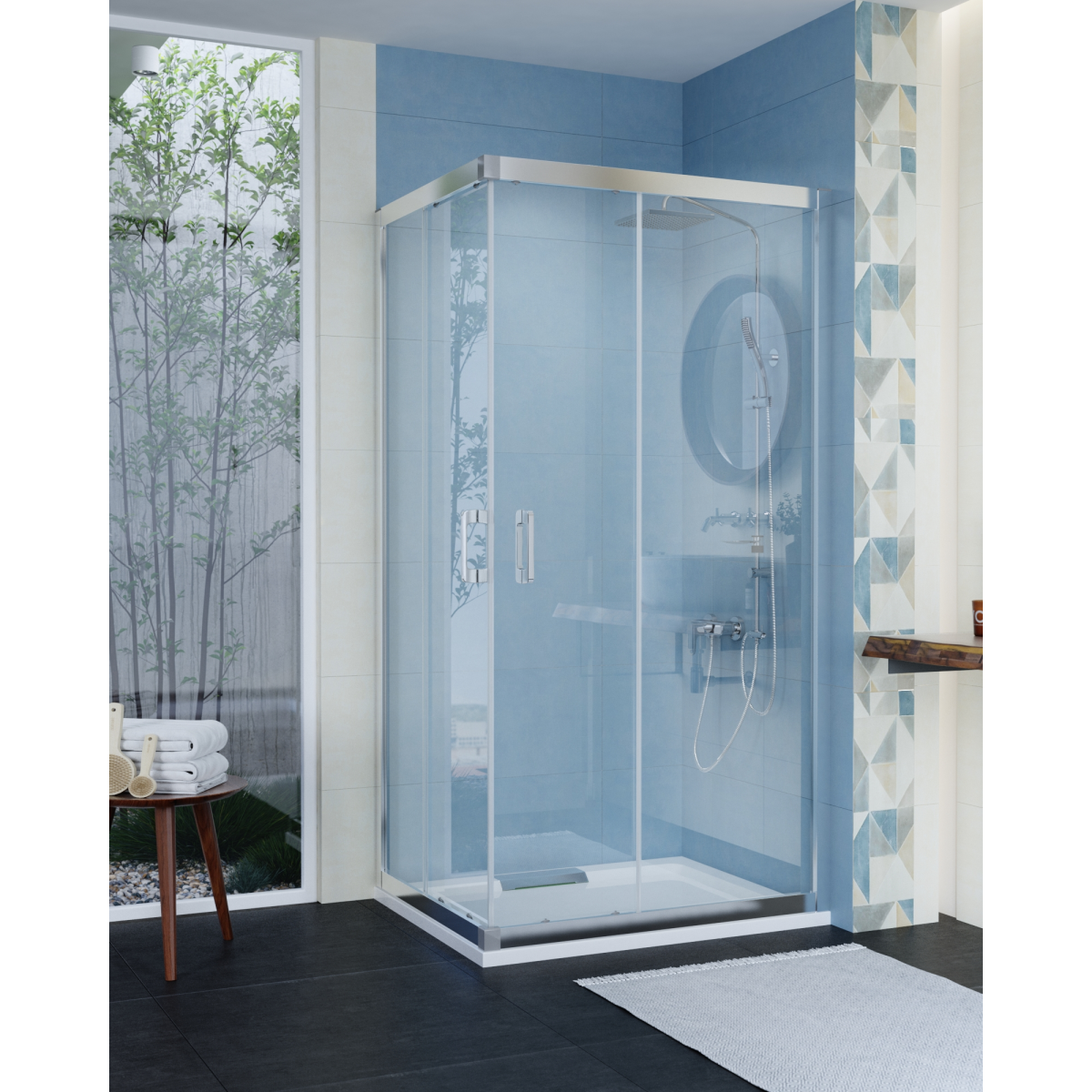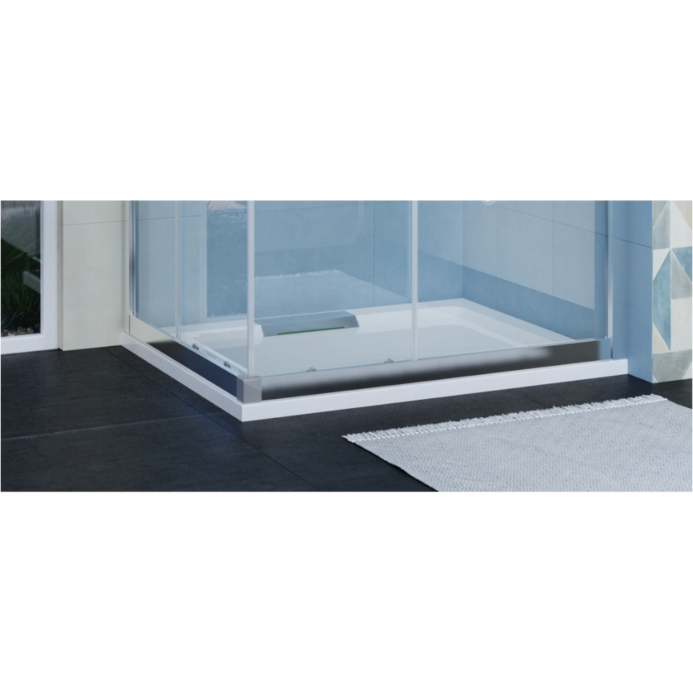 A 6 mm vastag, víztiszta edzett biztonsági üveg stabil felépítést ad, a dupla tolóajtó pedig kényelmes használatot biztosít anélkül, hogy plusz nyitási területet igényelne. A krómozott alumínium profilok letisztult megjelenést és tartós szerkezetet nyújtanak.