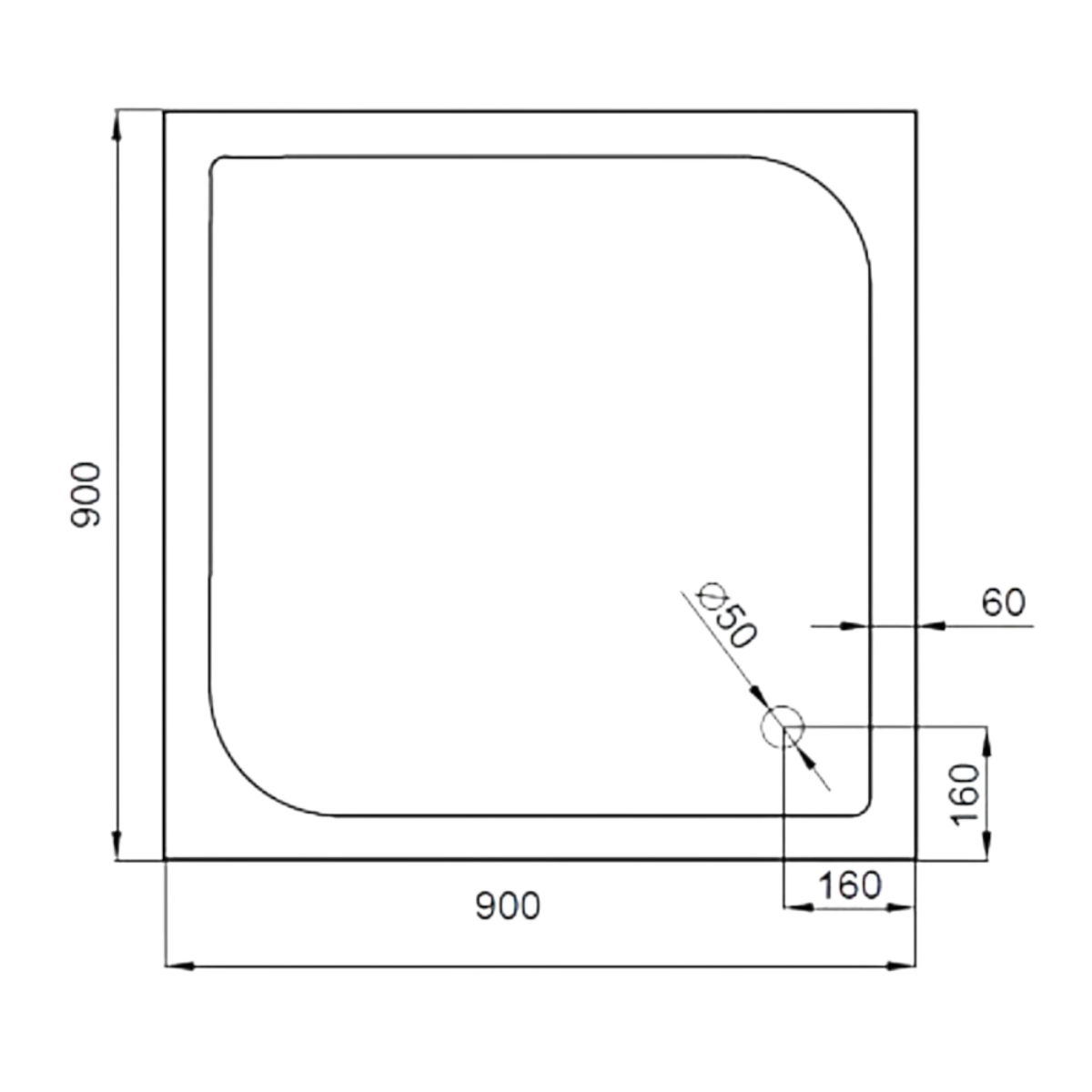 A 90 cm x 90 cm x 14 cm-es méret ideális a legtöbb zuhanykabinhoz, a szifon átmérője 50 mm.