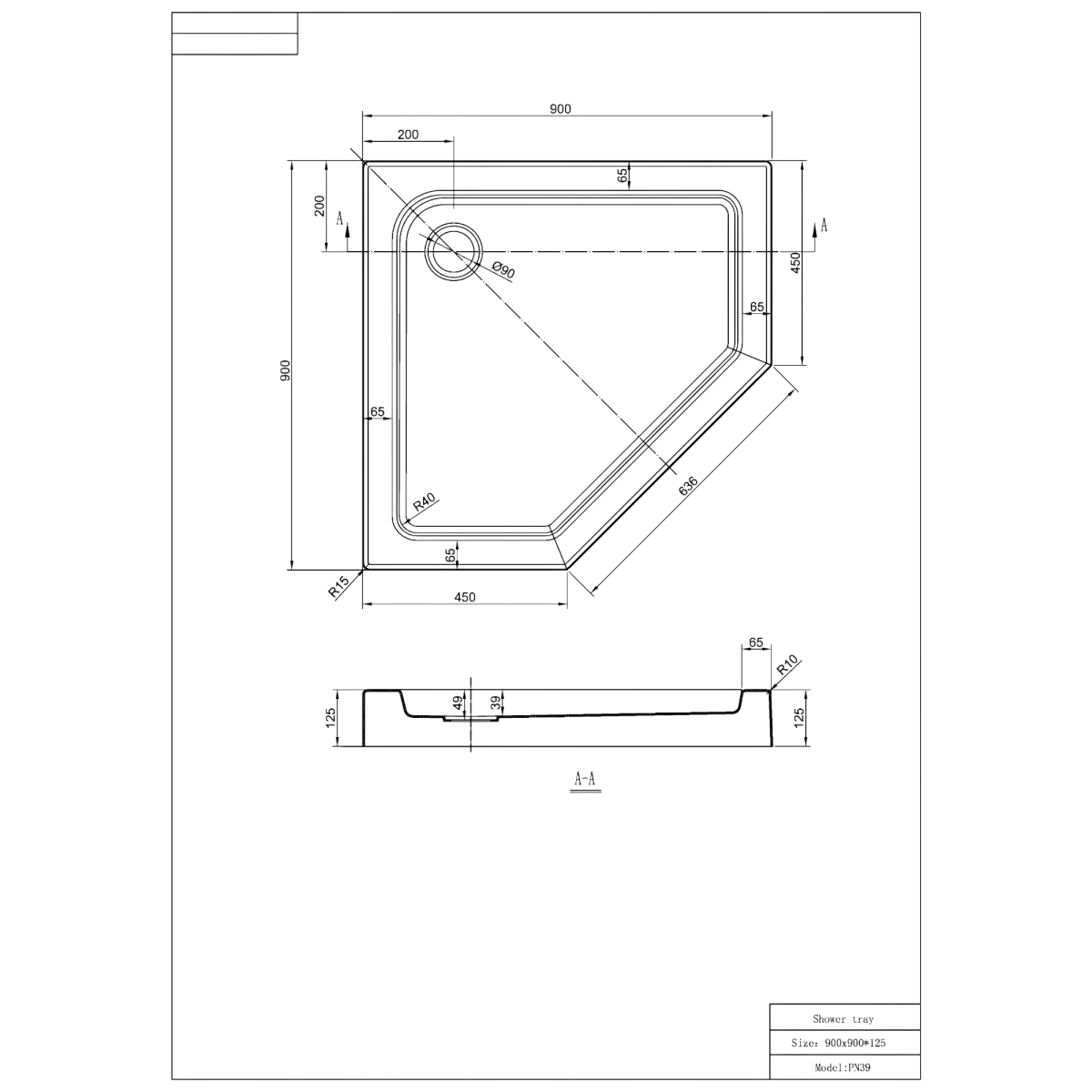 Zuhanytálca akril, 90x90x12,5cm ötszögletű