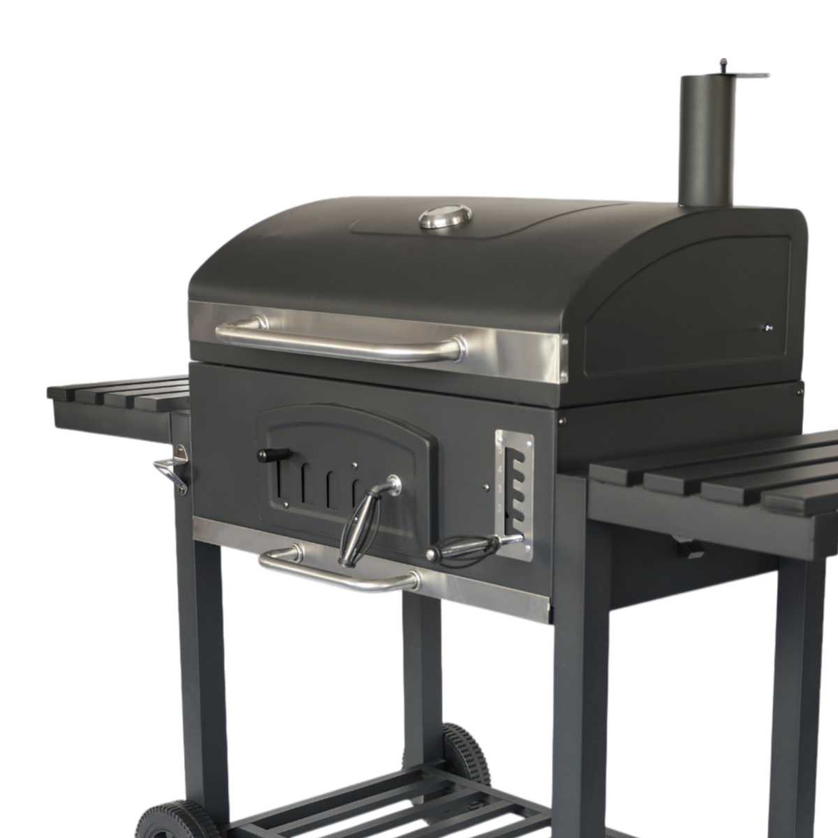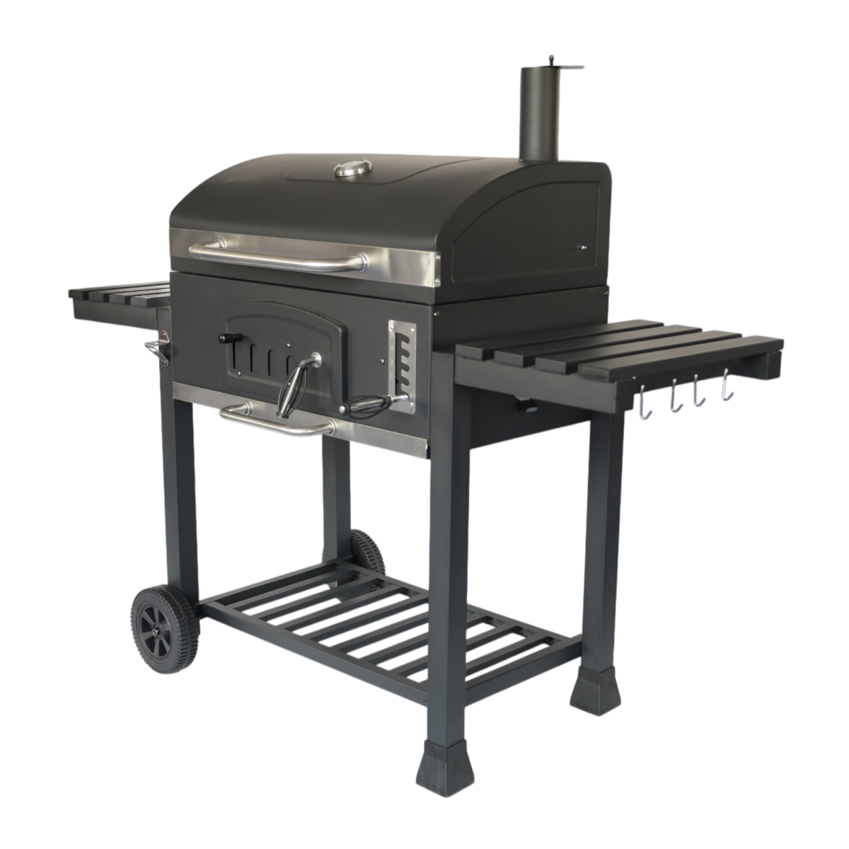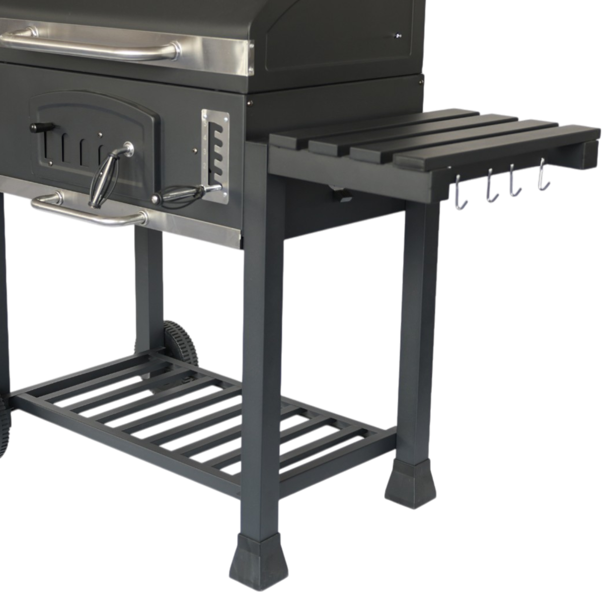 A krómozott acélból készült grillsütő felület, a kihúzható hamutálca és a praktikus faszéntartó megkönnyíti a használatot és a tisztítást. Az oldalpolcok tárolófelületként szolgálnak a grillezéshez szükséges eszközöknek.