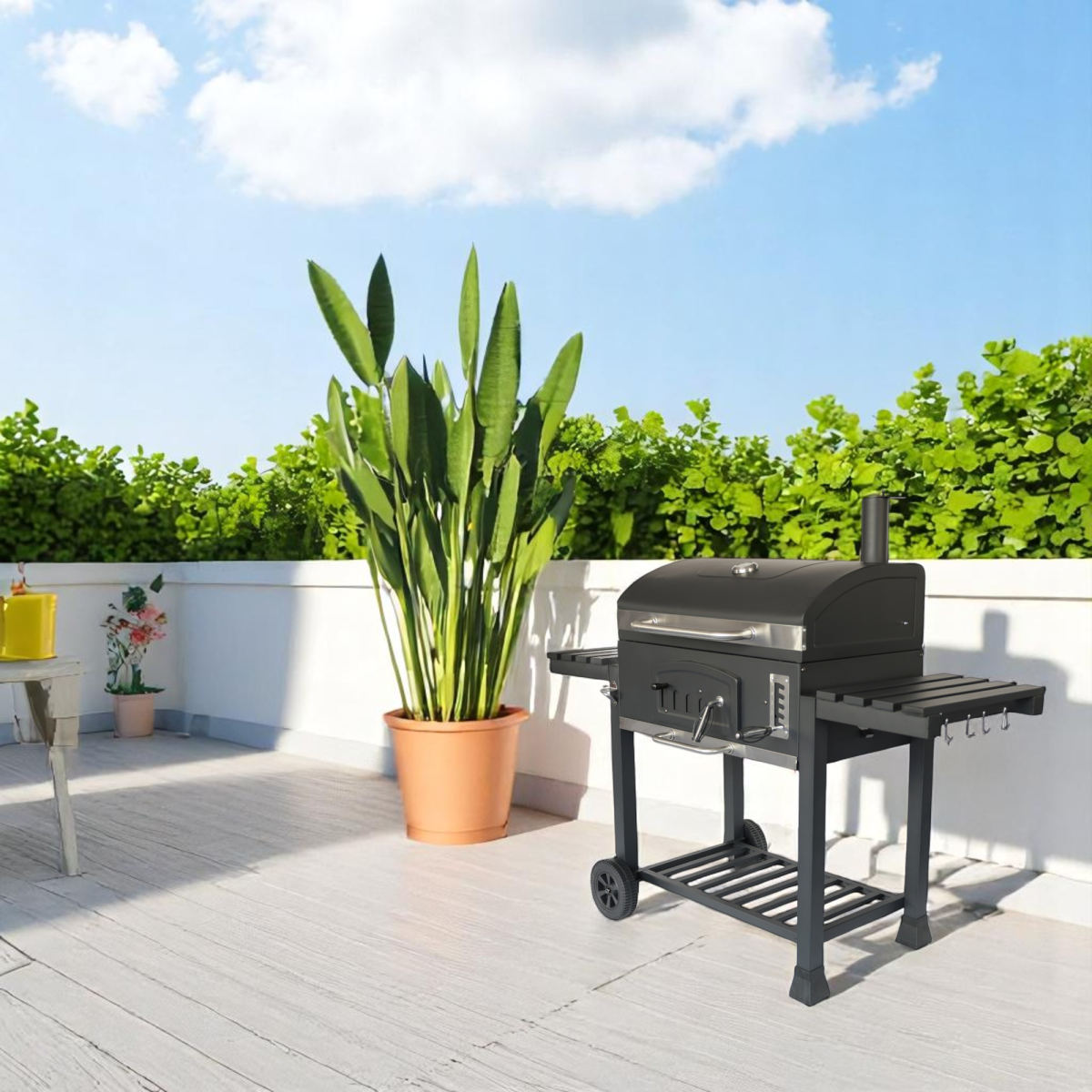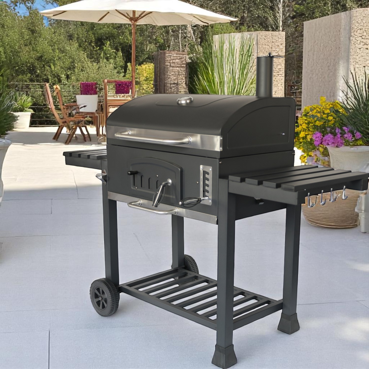 Ez a porfestett acéltesttel és rozsdamentes fogantyúkkal ellátott faszenes grill ideális választás szabadtéri sütésekhez, akár nagyobb társaság részére is.
