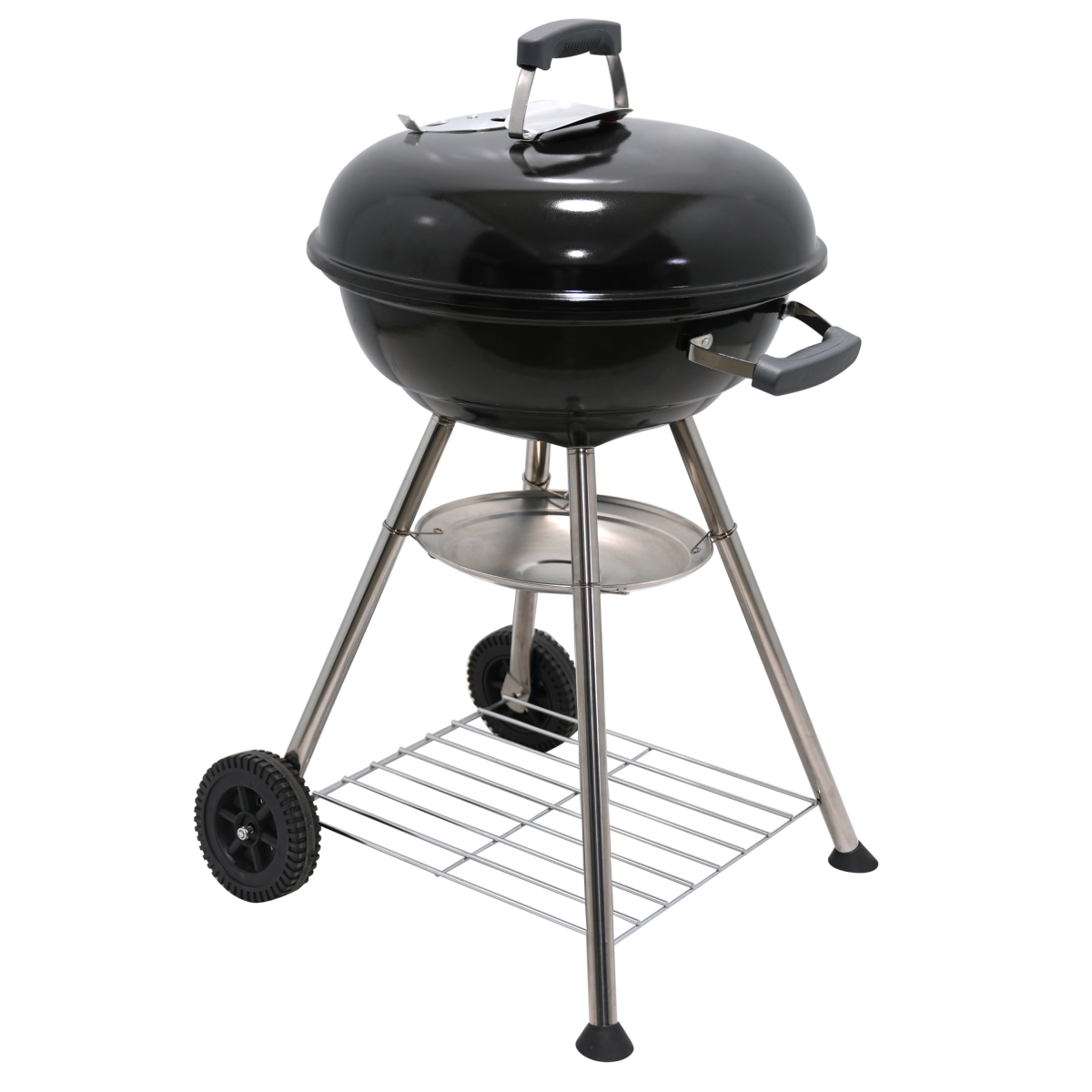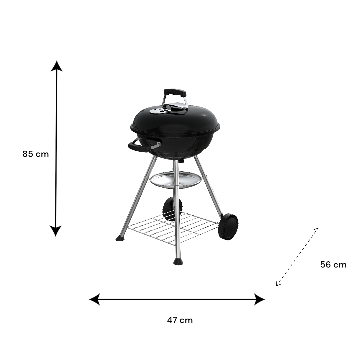 Az 56×47×85 cm-es faszenes gömbgrill a hagyományos faszenes grillezés kedvelőinek készült. Kompakt, mégis tágas kialakításának köszönhetően egyszerre több fogás is kényelmesen elkészíthető rajta. A porcelánzománcozott acél tűztér és fedél hosszabb élettartamot, a rozsdamentes acél szellőzők pedig pontos hőszabályozást biztosítanak. A stabil lábak, a beépített hamugyűjtő és a két kerék kényelmes használatot és könnyű mozgathatóságot garantálnak.