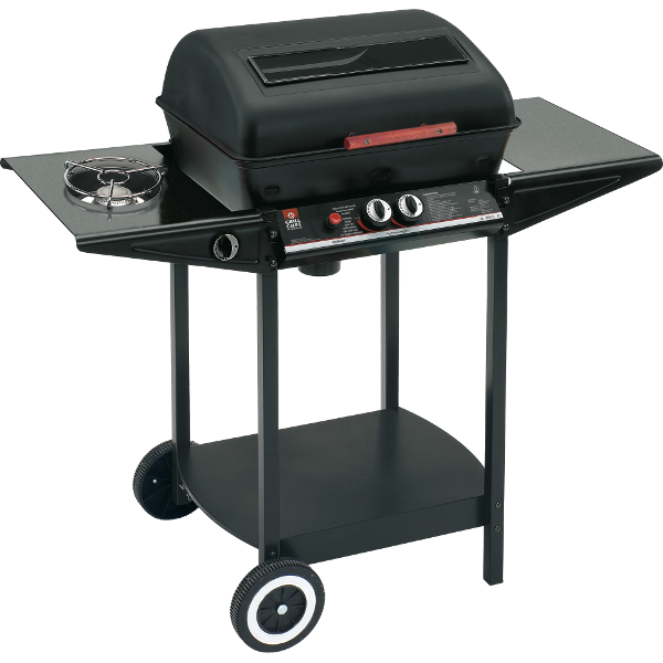 Gázgrillkocsi 2,1 égővédős, 5,5kW-os kétzónás nagy teljesítményű égővel és 1kW-os oldalégővel. A fedélbe épített betekintő ablakkal könnyen ellenőrízhető a készülő étel. Sütőfelület mérete: 49x38 cm.
