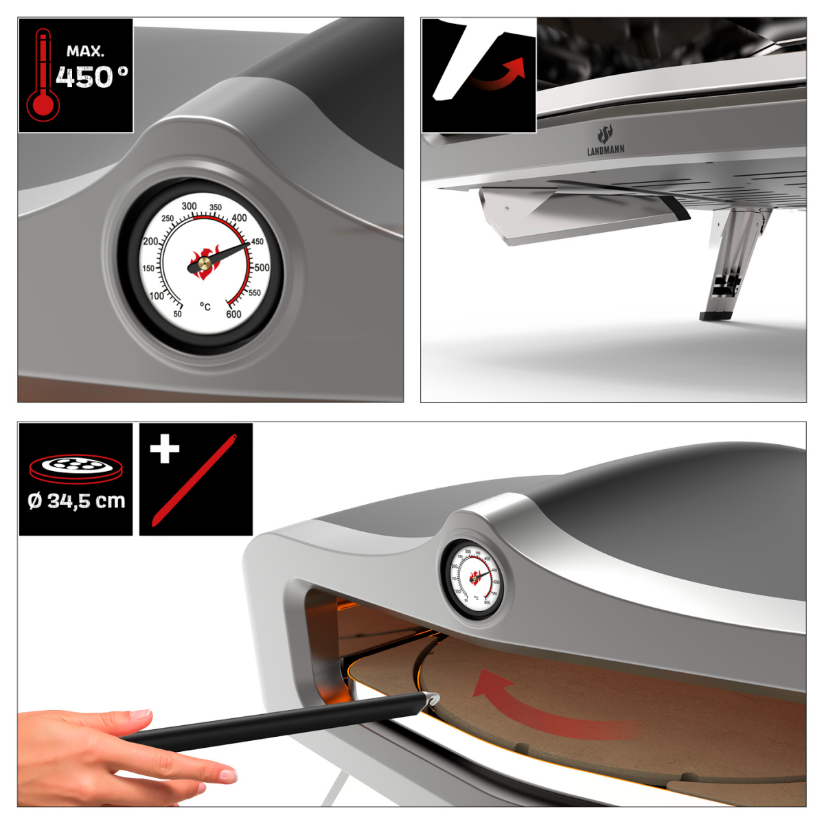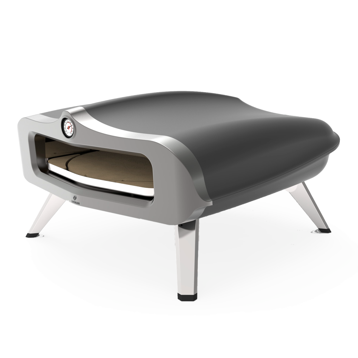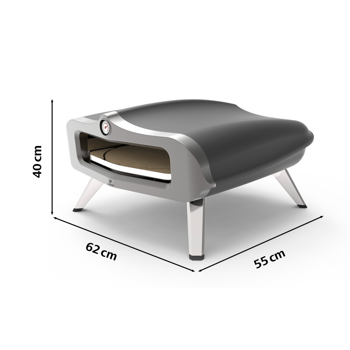 A 34,5 cm-es kordierit pizzasütő kő gyorsan felmelegszik, sütés közben kézzel forgatható, így egyenletes eredményt biztosít. A beépített hőmérő pontos hőszabályozást tesz lehetővé, az elektromos gyújtás pedig megkönnyíti az indítást. A négy behajtható nemesacél láb egyszerű szállítást és helytakarékos tárolást kínál, a mellékelt védőburkolat pedig biztonságos tárolást biztosít.