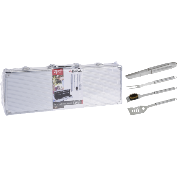Alumminium tartóban, 4 db grillkiegészítő: 1 villa 43cm, fém, 1 fogó- fém 43cm, 1 lapát 43cm- fém, 1 kefe 43cm- fém.