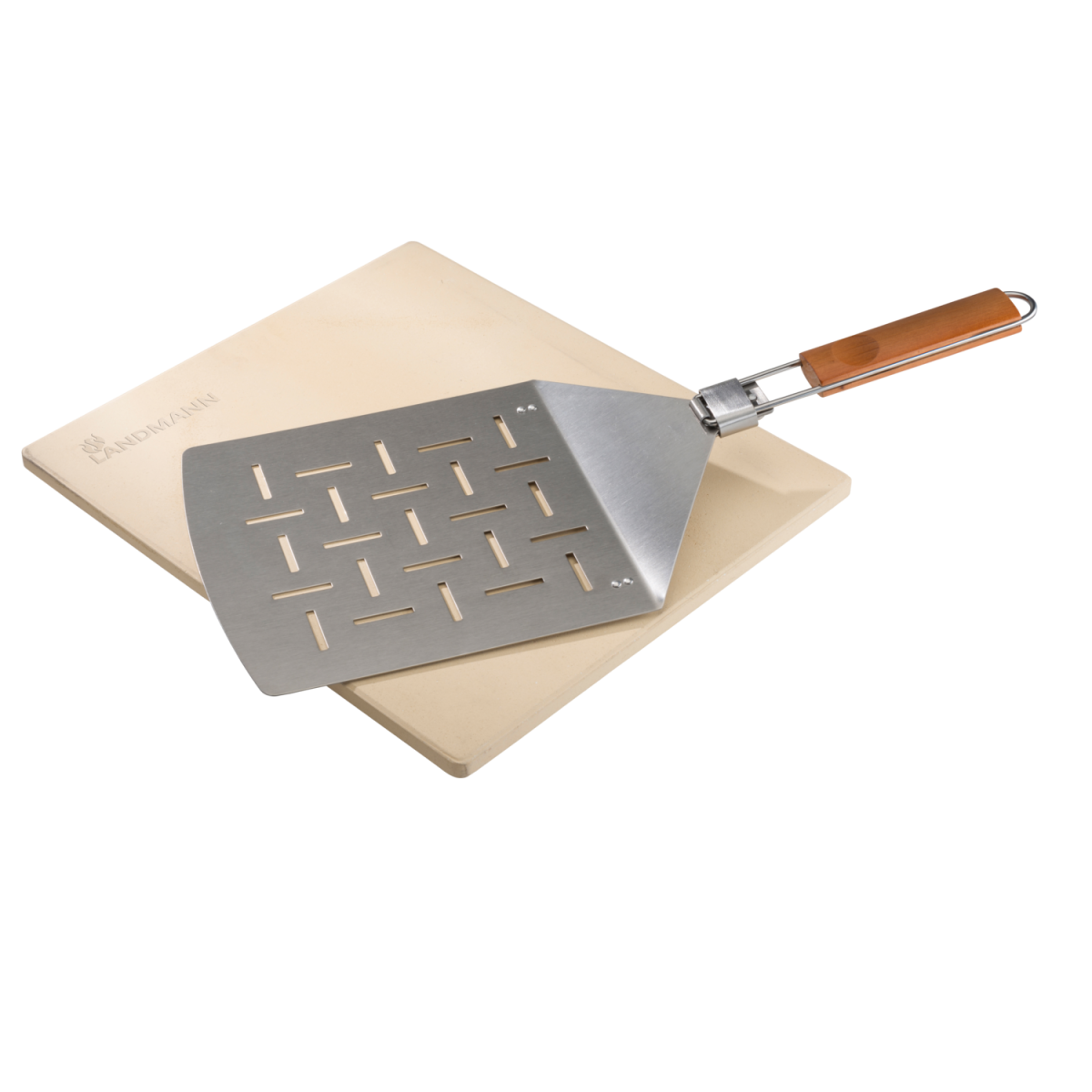 Prémium kategóriás 2 db-os pizza szett összecsukható sütőlapáttal (rozsdamentes acél, bambusz) és cordieritből készült pizzakővel. Lapát mérete: 8x37,5x4 cm, pizzakő mérete: 32x32x1,2 cm, faszenes és gázgrillekkel is kompatibilis.