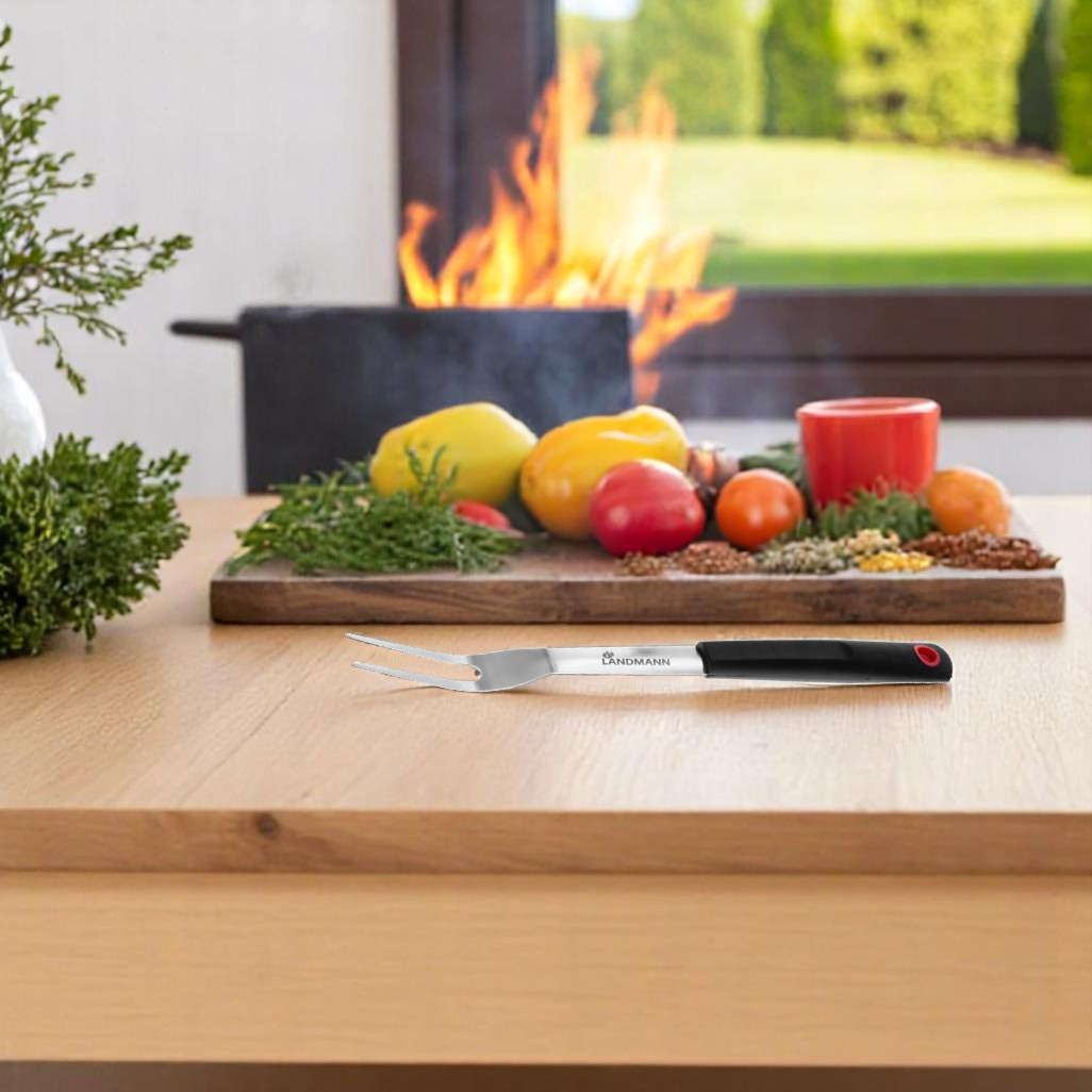 Rozsdamentes acél villa, gumírozott nyél. Praktikus és hasznos kiegészítője minden grill partinak, hiszen könnyen és biztonságosan kiszedhetőek a húsok a grillből.