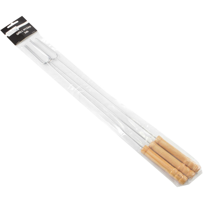 Krómozott fém grillnyárs fa nyéllel, 48 cm-es méretben.