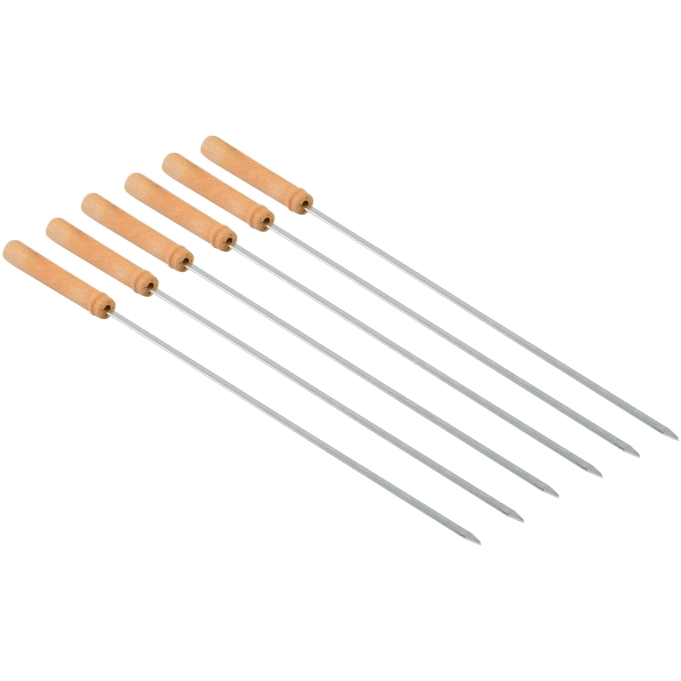 Krómozott fém nyárs fa nyéllel. A termék teljes hossza 40 cm. A csomag 6 darab terméket tartalmaz.