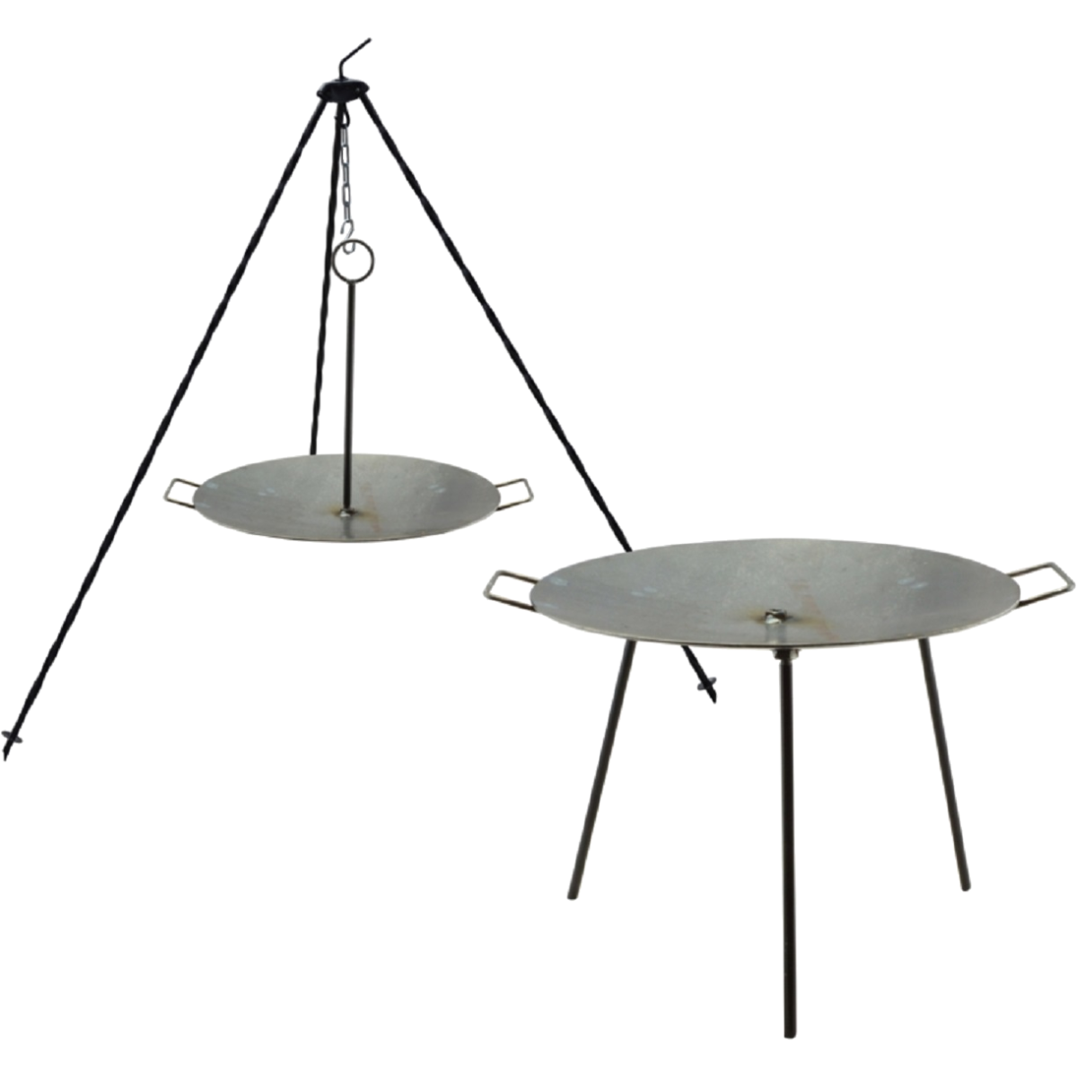 Vas tárcsa három lábbal és függesztővel, 40 cm-es. Használható hagyományos 3 lábú tárcsaként és bogrács állványra is akasztható. Szabad tűzön használható.