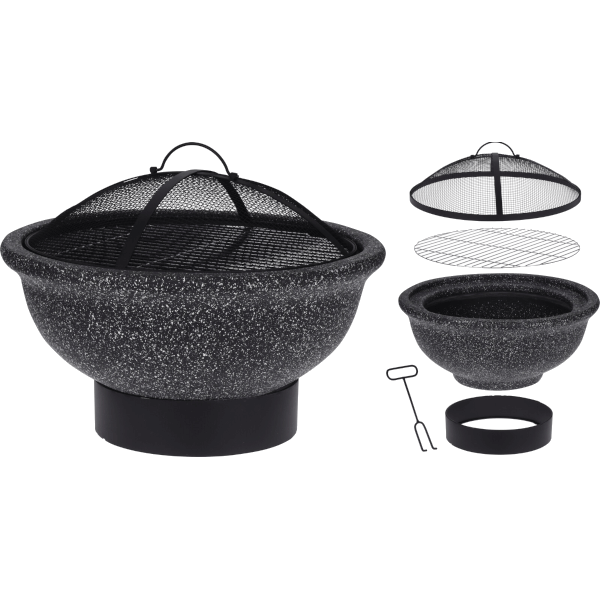 Tűzrakó tál, anyaga: a test égetett agyag , a tető fém. A hálós takaró mérete: 42x42x11cm.