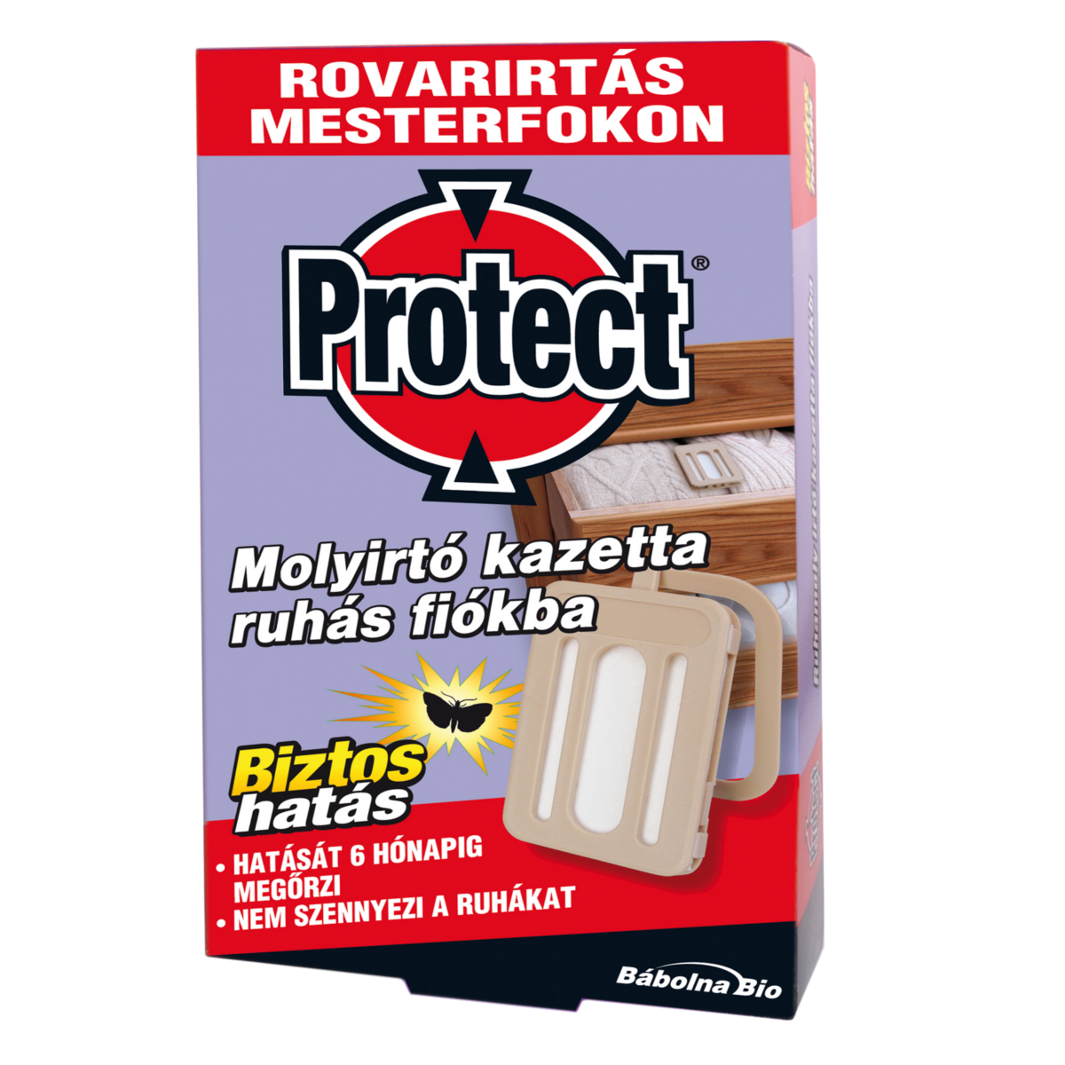 A PROTECT molyirtó kazetta ruhatároló helyeken (pl. ruhásfiókban, szekrényben, gardróbban) ruhamolylepkék és lárváik irtására alkalmas. Zárt térben ruhamoly lepkék írtására. Nem csöpög és nem hagy foltot, hatását párolgás útján fejti ki. Biztos védelmet nyújt a ruhákban, textíliákban fejlődő molyok ellen. Használata nem feltűnő, nem jár kellemetlen szagképződéssel. A készítmény 6 hónapon át egyenletes hatóanyag kibocsátást biztosít.