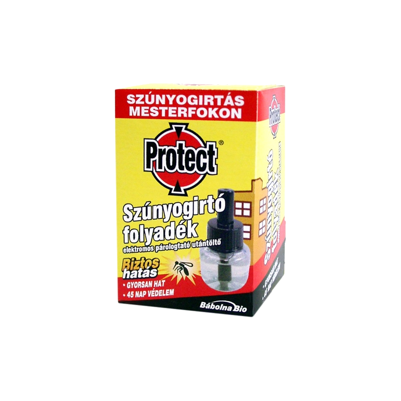 Protect szúnyogírtó folyadék utántöltő 45 napra. A PROTECT elektromos szúnyogirtó készülék + folyadék használatával a lakáson belül megelőzhetők a csípések és az általuk okozta kellemetlen panaszok. A hálózati kapcsolóval ellátott készülék gazdaságosan használható, mert a készülék konnektorból történő eltávolítása nélkül, egyszerűen kikapcsolható.