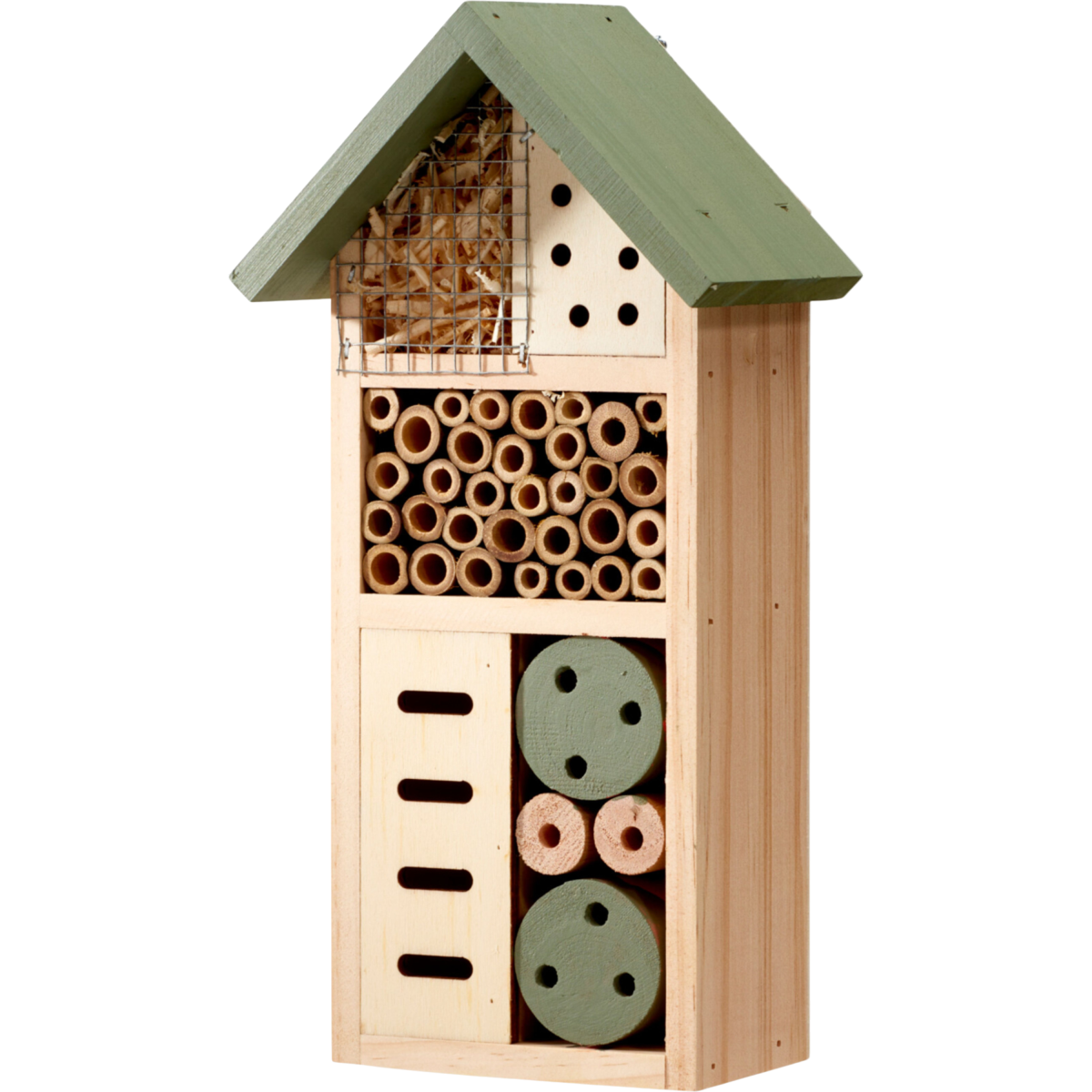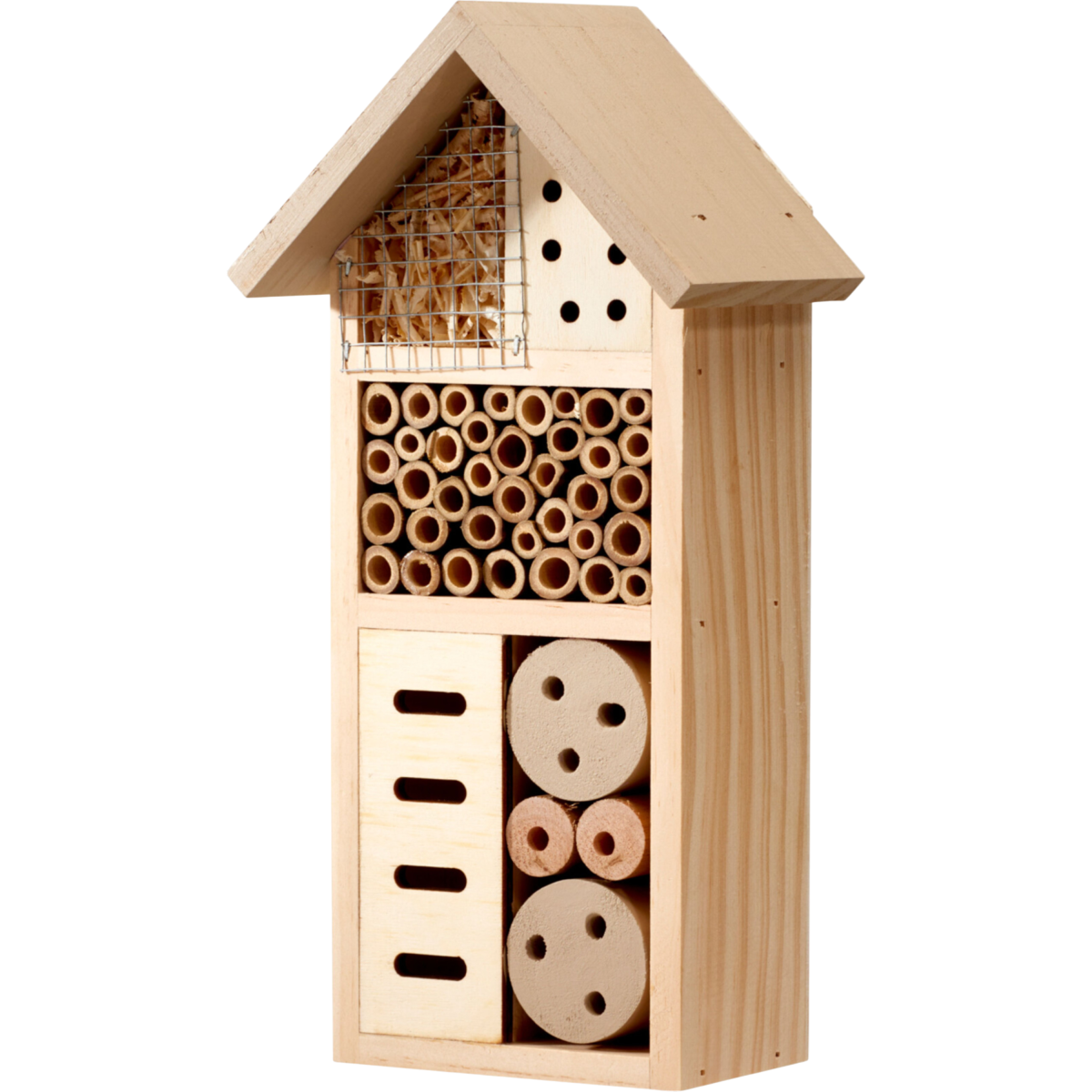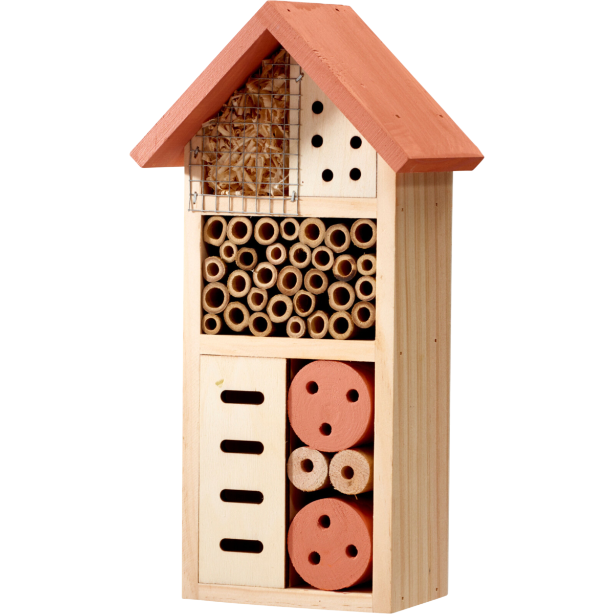 Ez a fenyőfából készült rovarhotel praktikus és dekoratív kiegészítő a kertben, amely ideális élőhelyet biztosít a beporzó rovaroknak és más hasznos élőlényeknek. A különböző rekeszek kialakítása lehetővé teszi, hogy többféle rovarfaj is menedéket találjon benne. Természetes anyagának és szellőző szerkezetének köszönhetően jól illeszkedik a kerti környezetbe.